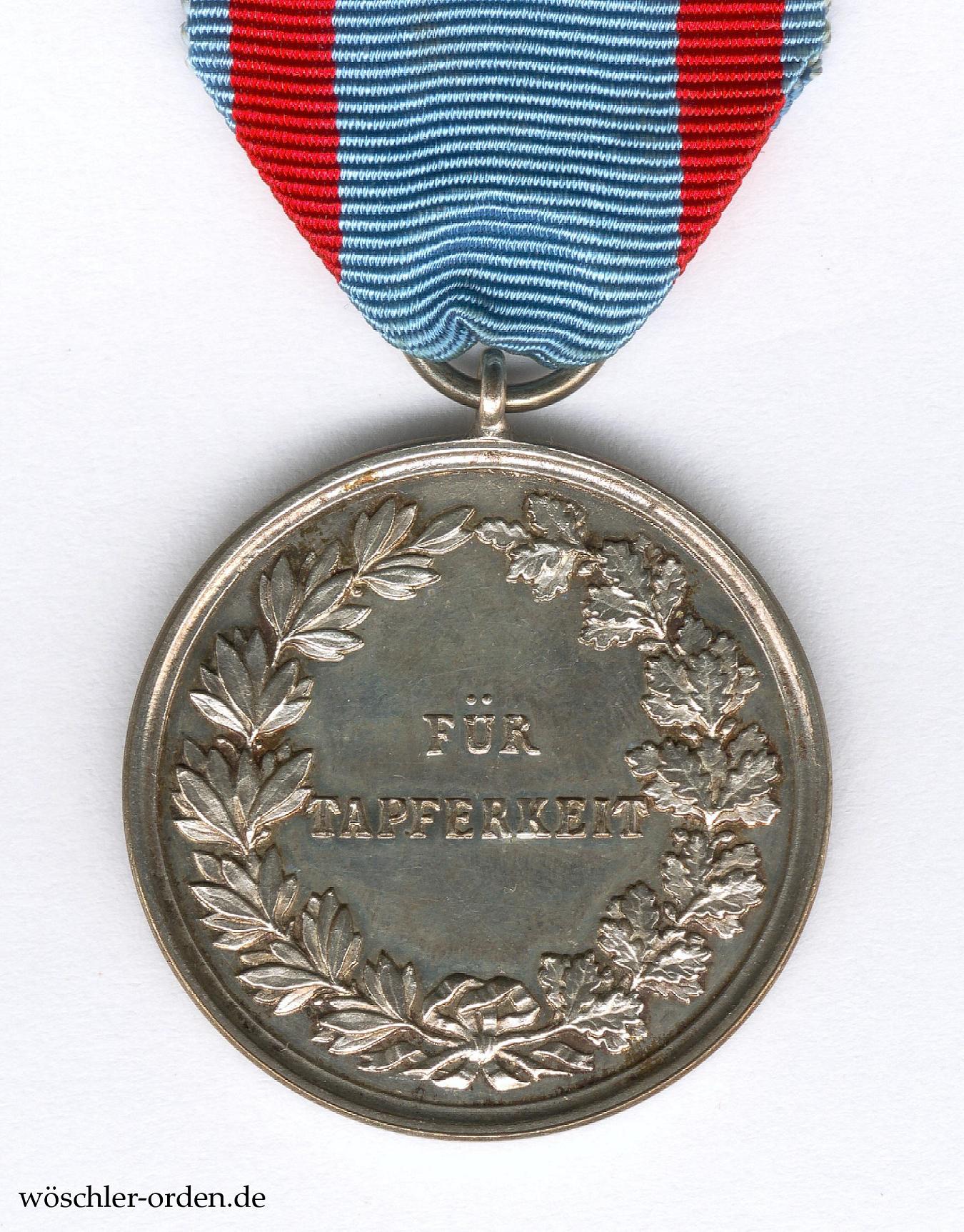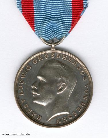 Ausgabe mit der Inschrift Für Tapferkeit des ab 1894 verliehenen vierten Modells mit dem Portrait Ernst Ludwigs. Mutmaßlich spätere, private Bedarfsprägung („Schnallenstück“). Wohl Silber geprägt, an angelöteter Ringöse mit offenem Bandring.
