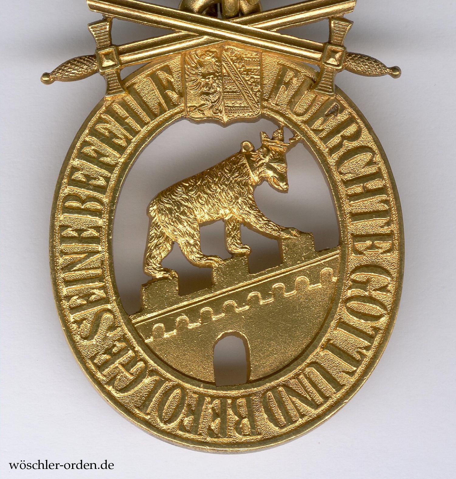 Fertigung wohl aus der Zeit des Weltkrieges. Bronze einteilig massiv gefertigt, wohl geprägt, nachbearbeitet und vergoldet. An parallel angelöteter Ringöse aus einem dicken Runddraht, an diesem die beidseitig geprägten Schwerter angelötet. Der längliche Sprungring ebenfalls vergoldet und, wie für die anhaltischen Ordenszeichen üblich, ohne eine Hersteller- oder sonstige Punzierung. Scharfenberg schätzt, dass in beiden Komturklassen insgesamt nur etwa 40 (!) Verleihungen mit Schwertern erfolgt sind, die allerdings nur zu einem Teil namentlich nachweisbar sind.