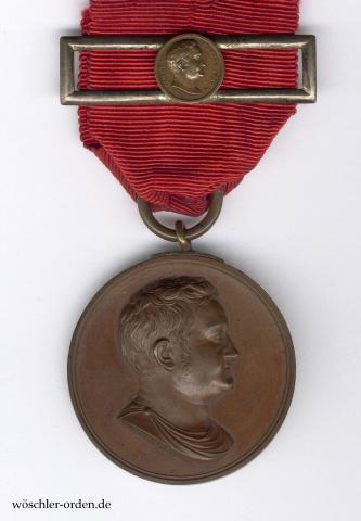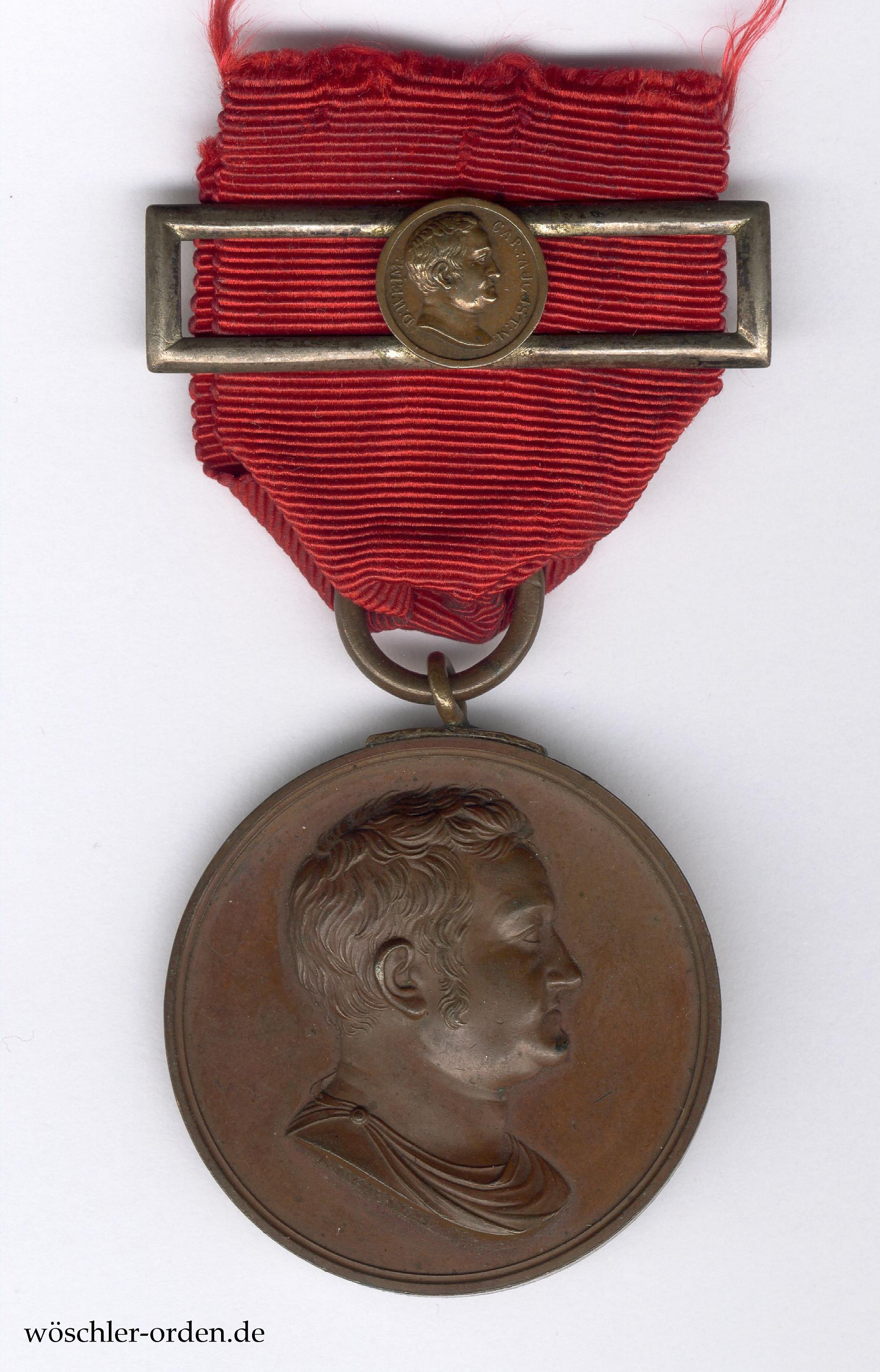 Diese erste Zivilverdienstmedaille Sachsen-Weimars wurde durch Großherzog Carl August während seines Aufenthaltes in Paris 1814/15 als Geschenk des Landesherrn und für ziviles und militärisches Verdienst in den drei Stufen Gold, Silber und Bronze gestiftet. Geschaffen wurde sie mit zwei verschiedenen Rückseiten; bei der Auswahl der lateinischen Inschriften und auch der Gestaltung insgesamt war neben dem Großherzog auch dessen Geheimer Rath Johann Wolfgang von Goethe maßgeblich beteiligt. Anfangs nichttragbar, wurde die Medaille seit einem Publicandum von 20. Juni 1820 teilweise mit der ausdrücklichen Erlaubnis, sie am Bande des Hausordens zu tragen, verliehen. Ab Anfang 1829 sind außerdem Verleihungen am landesfarbenen Band erfolgt. Geprägt wurden in Bronze mit dieser Rückseite 200 Exemplare.