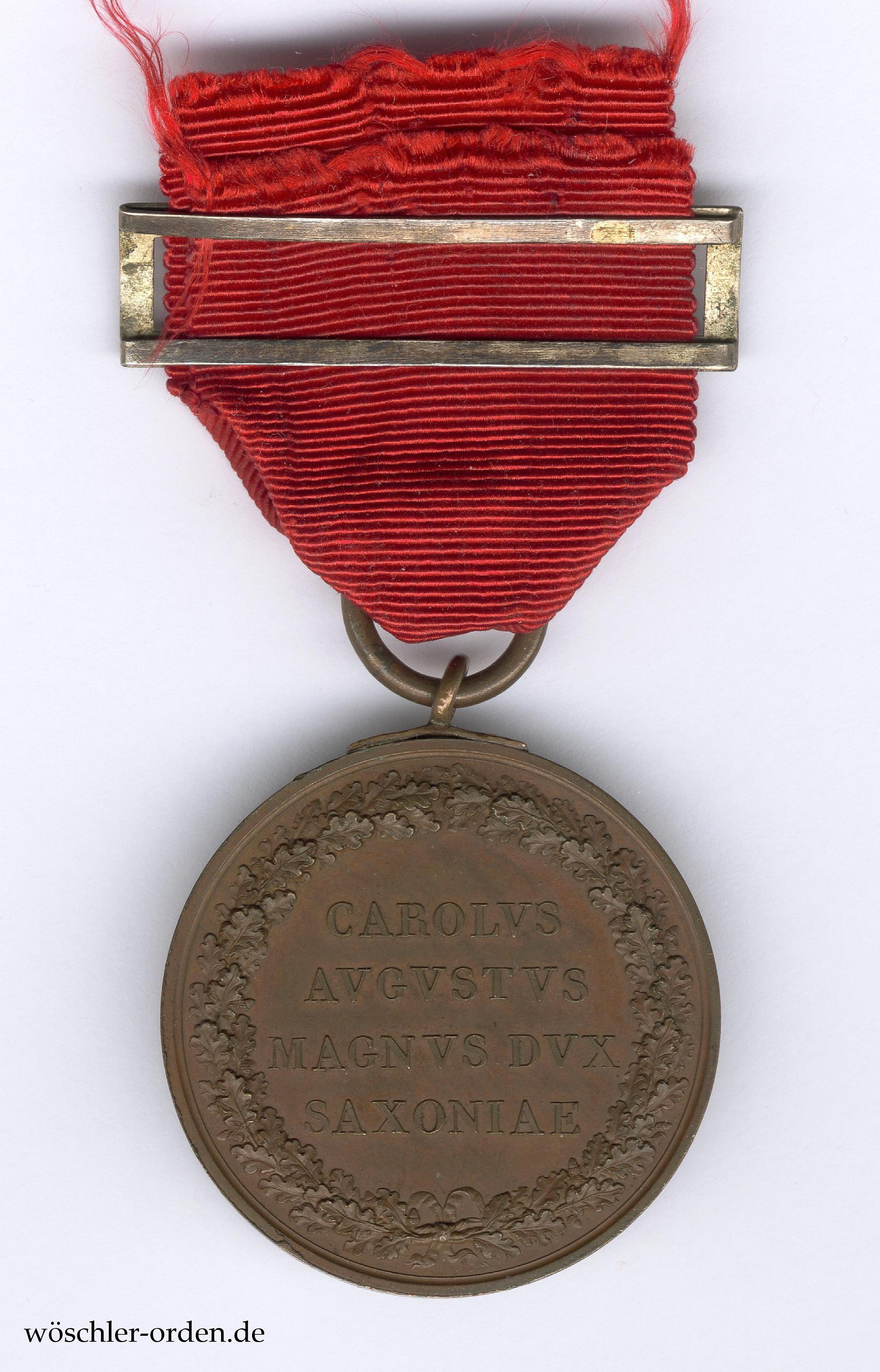 Tragbare Ausführung der Ausgabe mit der vierzeiligen Rückseiteninschrift „CAROLVS / AVGVSTVS / MAGNVS DVX / SAXONIAE“. Bronze geprägt und patiniert, an stabiler, mittels eines angelöteten Blechstreifens angelöteter Ringöse mit stabilem, geschlossenem Bandring.