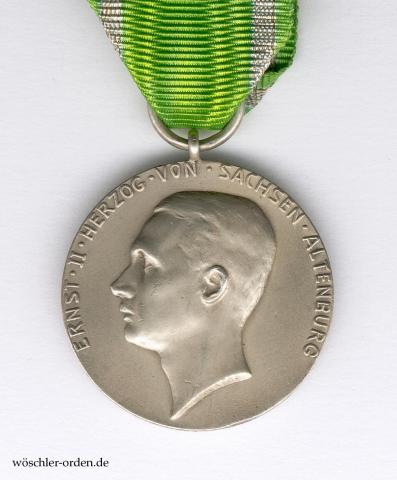 Exemplar des zweiten und endgültigen, ab 1908 verliehenen Modells mit dem Portrait Herzog Ernst II. Silber geprägt und mattiert, mit angelöteter Ringöse mit geschlossenem Bandring. Im Halsabschnitt die Signatur „GENTHE“ der Bildhauerin Julie Genthe, Leipzig, von der die Entwürfe stammten. Geprägt wurden die Medaillen bei der Firma Glaser & Sohn, Dresden.