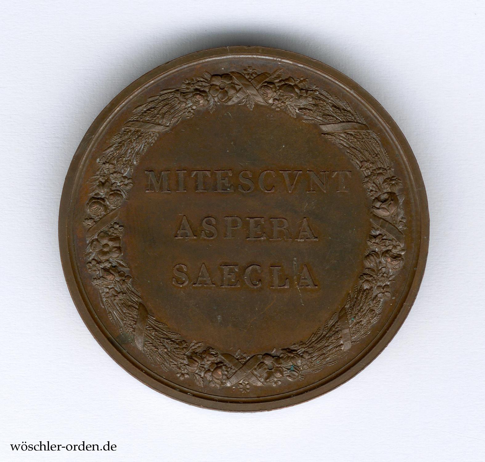 Ausgabe mit der Rückseiteninschrift „MITESCVNT / ASPERA / SAECLA“. Bronze geprägt, ungehenkelt. Vorderseitig das nach rechts gewendete Portrait des Stifters in antiker Gewandung, am Halsabschnitt Signatur „ANDRIEU F.“. Rückseitig besagte dreizeilige Inschrift in mit einer Bandschleife gebundenem Erntekranz aus Ähren, Rosen und Feldblumen.
