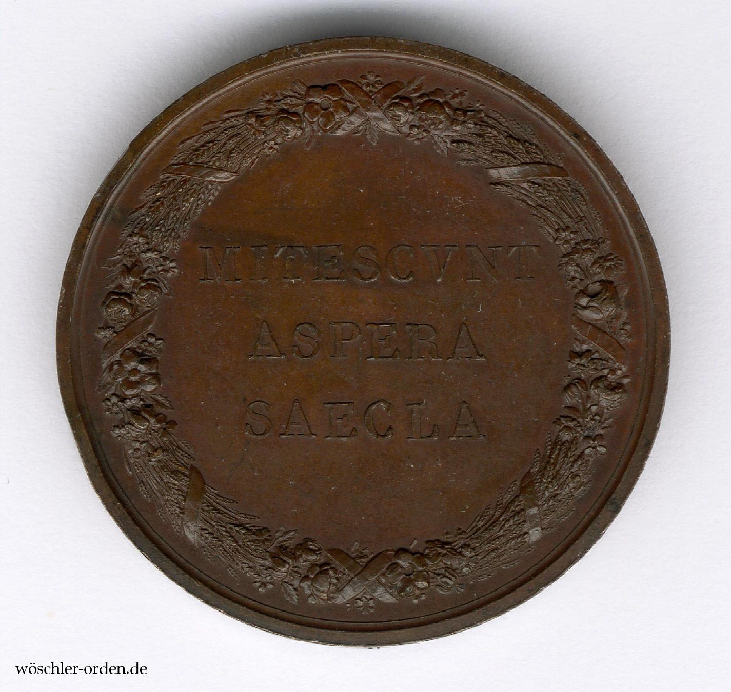 Ursprüngliche, nichttragbare Ausgabe mit der dreizeiligen Rückseiteninschrift „MITESCVNT / ASPERA / SAECLA“. Bronze geprägt und patiniert, vorderseitig das nach rechts gewandte Portrait des Stifters in antiker Gewandung, am Halsabschnitt die Signatur „ANDRIEU F.“ des namhaften Pariser Stahlstechers, Graveurs und Medailleurs Bertrand Andrieu, der auch das wohl berühmteste Medaillenportrait Napoléons schuf. Rückseitig besagte Inschrift in mit einer Bandschleife gebundenem „Erntekranz“ aus Ähren, Rosen und Feldblumen.