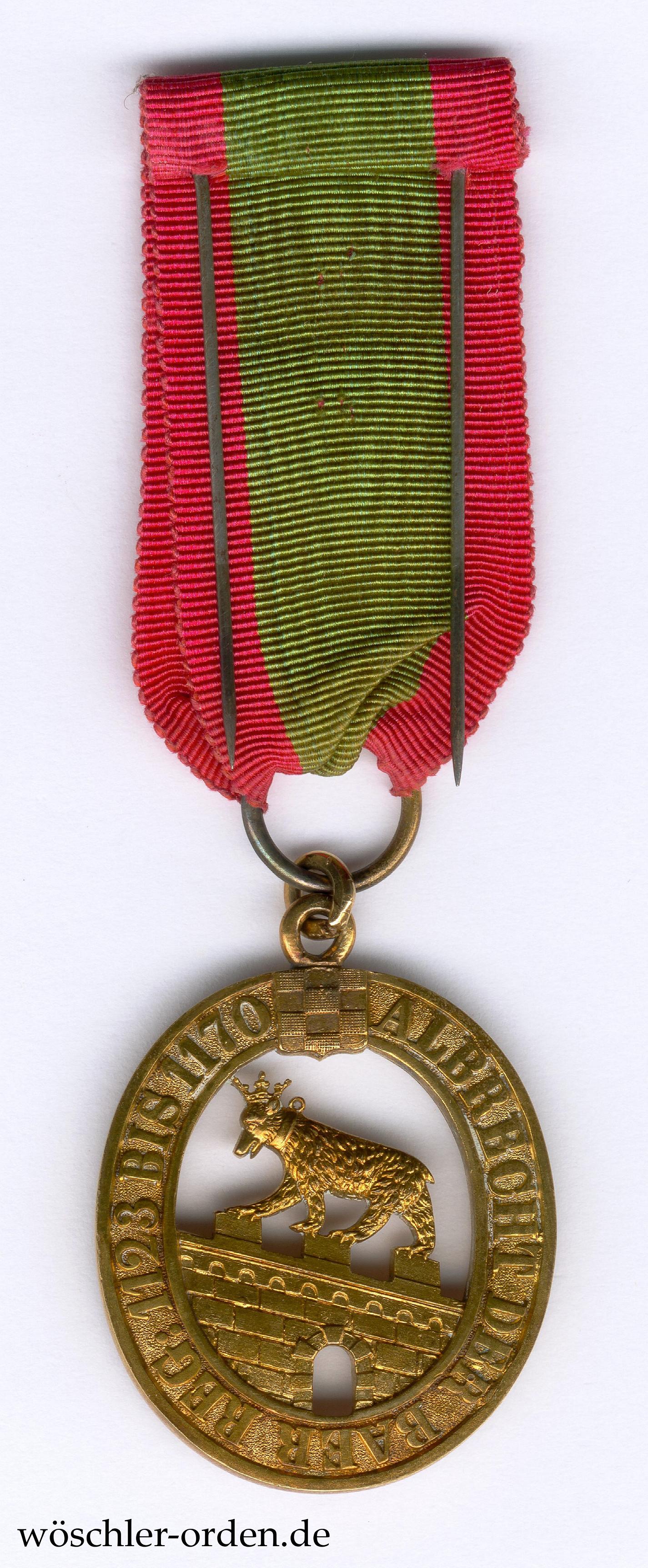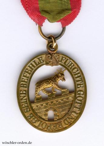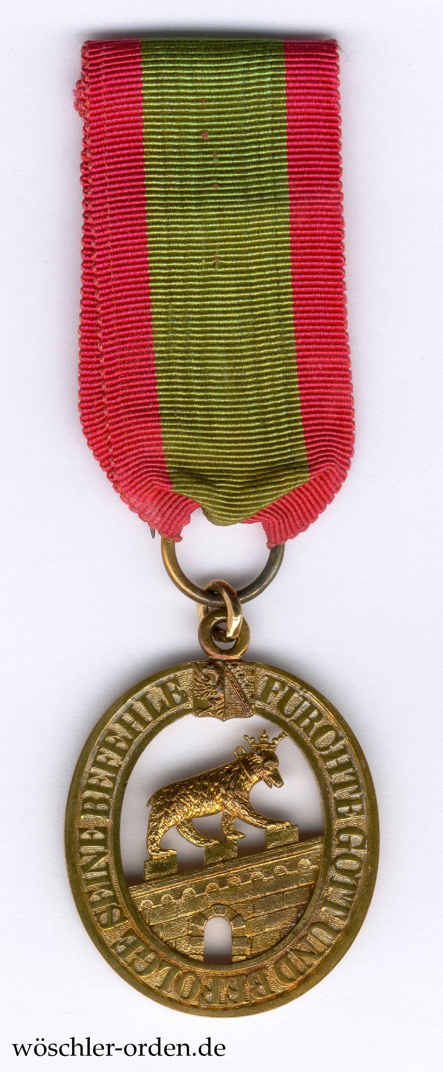 Bronze einteilig geprägt und vergoldet, an angelöteter Parallelöse mit offenem Bandring, verbunden durch ein kleineres Ringchen. Aufgrund der Schreibweise „FÜRCHTE“ wohl Exemplar des späten 19. Jahrhunderts. Insgesamt erfolgten in dieser Klasse etwa 1700 Verleihungen. Wegen der Wiederverleihung remittierter Ordenszeichen ist von einer geringeren Anzahl hergestellter Stücke auszugehen.