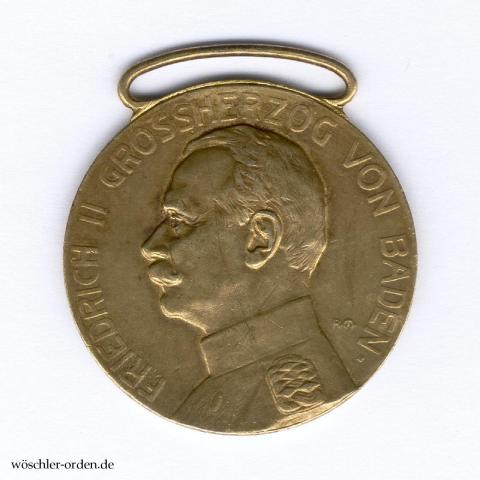 Exemplar des von 1908 bis 1918 verliehenen neunten (bei Volle: dreizehnten) Modells mit dem Portrait Großherzog Friedrich II., in der zweiten, ab wohl Juni oder Juli 1914 geprägten „unechten“ Ausgabe. Silber geprägt und vergoldet, an angelötetem Tragebügel. Das Portrait der Vorderseite schuf der Medailleur und Ziseleur Prof. Rudolf Mayer. Unter Friedrich II. sind insgesamt 1893 Verleihungen der Kleinen Goldenen Verdienstmedaillen nachweisbar, davon 475 am Bande der Militärischen Karl-Friedrich-Verdienstmedaille.