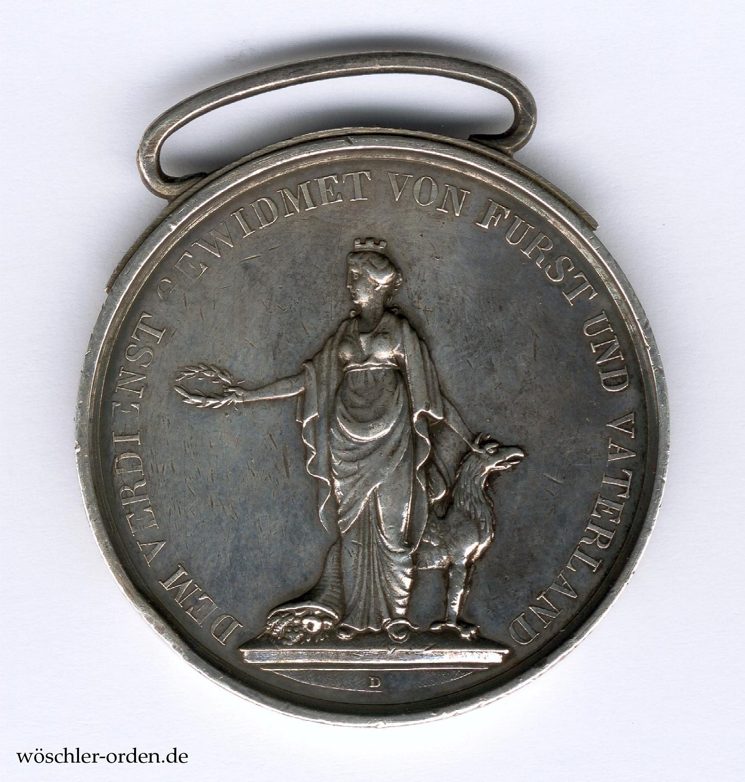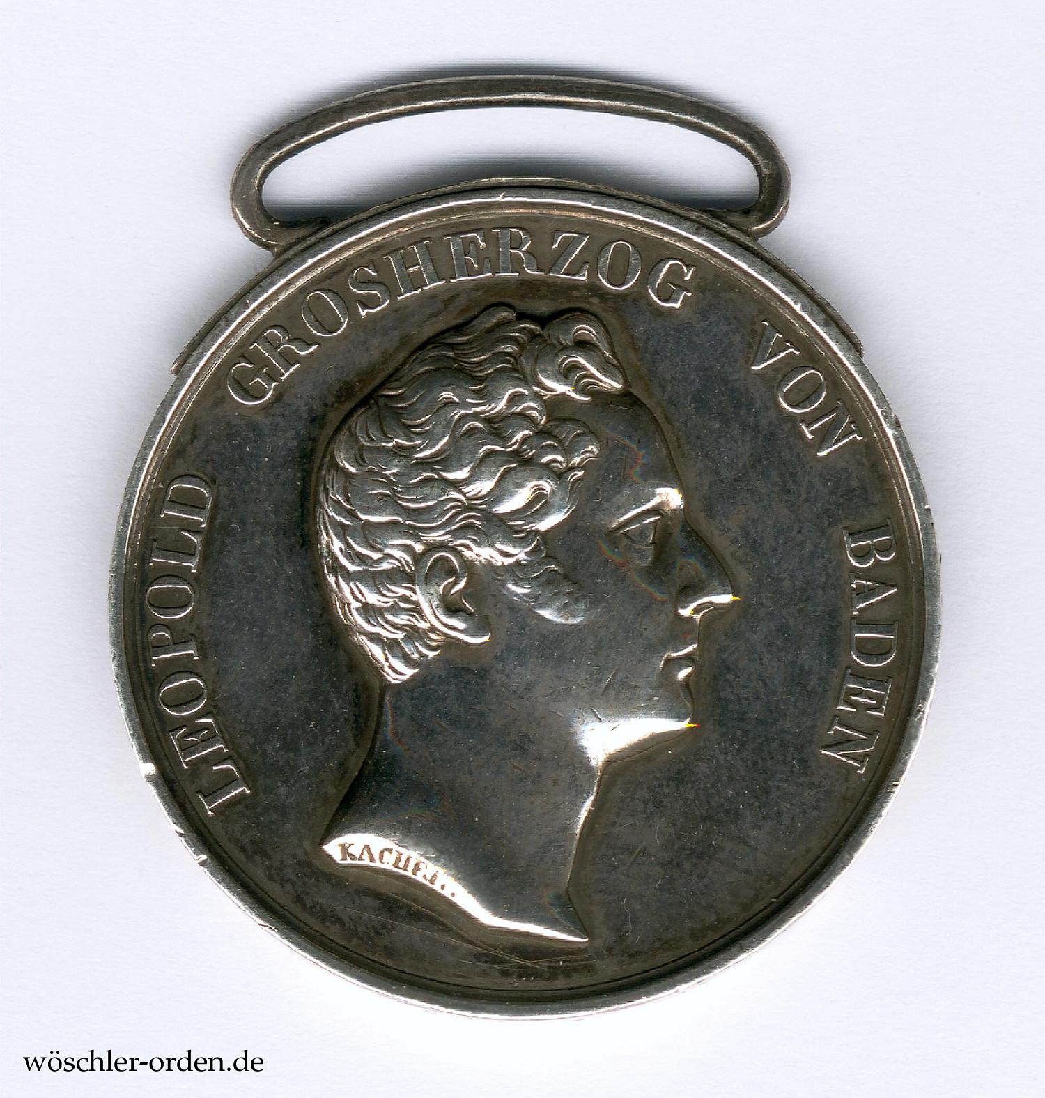 Exemplar des von 1831 bis 1852 verliehenen vierten (bei Volle: achten) Modells mit dem Portrait Großherzog Leopolds, hier von, nach Volle, Aversstempel „A“ und Reversstempel „Z“, wobei letzterer bereits deutliche Prägeschwächen aufweist. Den Stempel der Vorderseite schuf Ludwig Kachel, den der Rückseite Carl Wilhelm Doell. Silber geprägt, an mittels eines Silberblechstreifens angelötetem Tragebügel. Unter Großherzog Leopold sind insgesamt 321 Verleihungen Silberner Verdienstmedaillen nachweisbar, die sich in unbekannten Anteilen auf fünf unterschiedliche Stempelkopplungen zweier Vorder- und dreier Rückseiten verteilen.