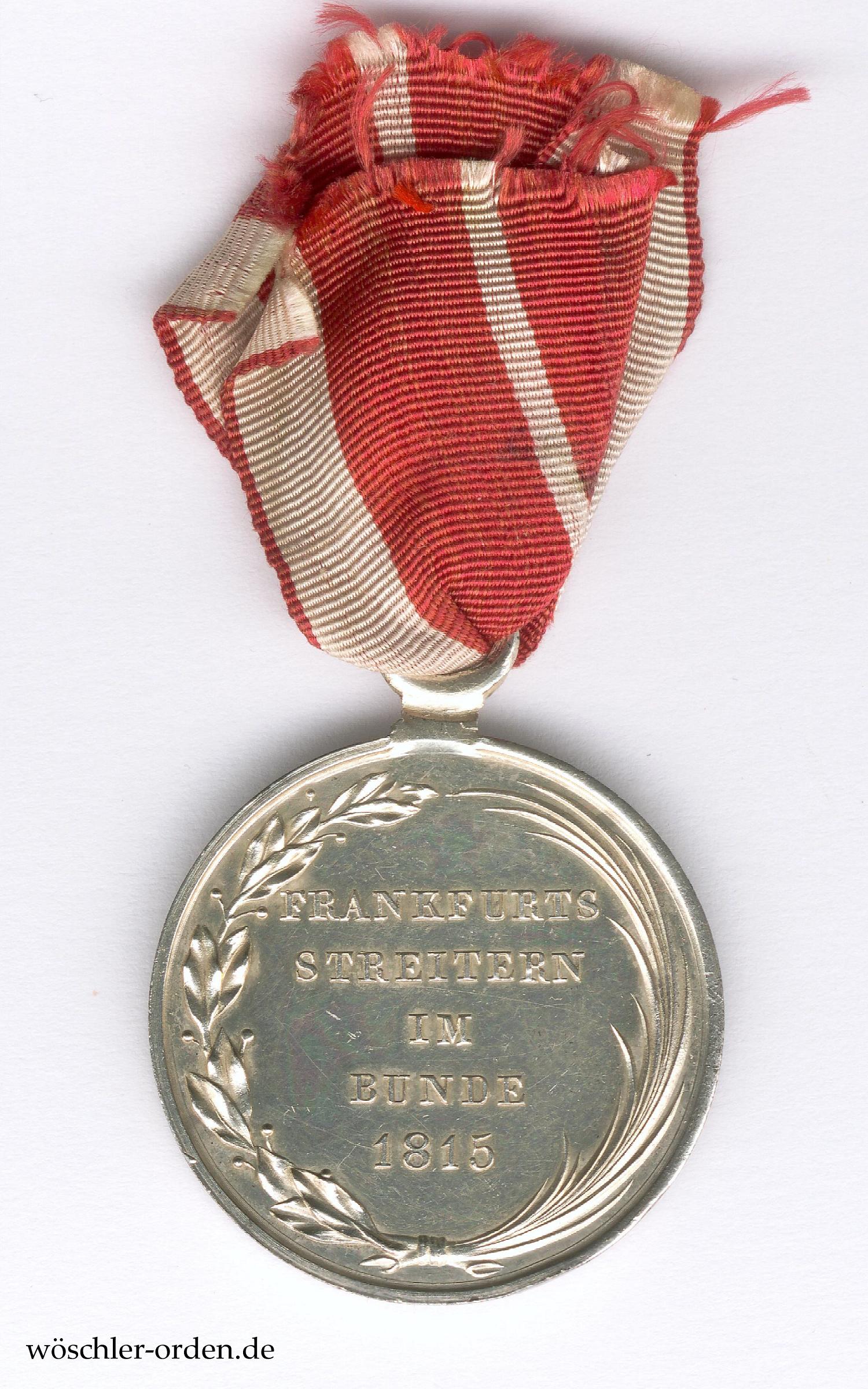 Literatur: Löbner, Volker und Lombard, Tilman. Frankfurter Orden und Ehrenzeichen 1806 – 1866. Aus dem Bestand des Historischen Museums Frankfurt am Main. Sulzbach/Ts. 2015. Vgl. S. 42–47.
