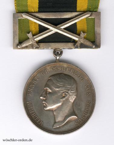 Nach Beginn des Weltkrieges verfügte Großherzog Ernst Wilhelm, dass der rückseitigen Inschrift des Allgemeinen Ehrenzeichens „DEM VERDIENSTE“ die Jahreszahl „1914“ hinzugefügt werden solle. Klee gibt an, dass 4911 Medaillen in Silber mit Schwertern verliehen wurden, von denen Lundström und Krause lediglich 3887 Träger namentlich auflisten. Die Verleihungen der Medaille als staatliche Auszeichnung endeten zwar 1918, allerdings vergab der vormalige Großherzog aus seinem Exil in Heinrichsau weiterhin, bis zu seinem Tod im Jahre 1923, Medaillen als „Erinnerungsstücke“.