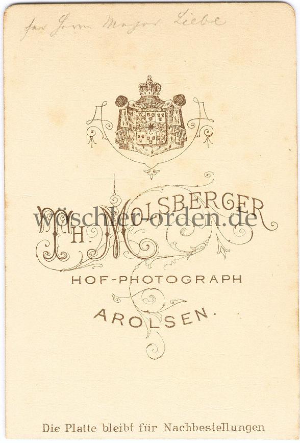 CDV-Format, aufgenommen beim Hof-Photographen Th. Molsberger in Arolsen, wohl in den 1880er-Jahren. Rückseitig handschriftliche Widmung „für Herrn Major Liebe“ in Bleistift.
