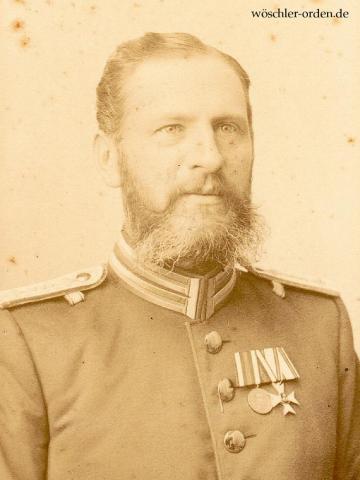 Fürstentum Waldeck und Pyrmont, Portraitphotographie eines Militärs wohl im Infanterie-Regiment „von Wittlich“ (3. Kurhessisches) No. 83, Arolsen, im Subalternoffiziersrang. Er trägt eine 2-teilige Große Ordensschnalle, an der sich folgende Auszeichnungen befinden: