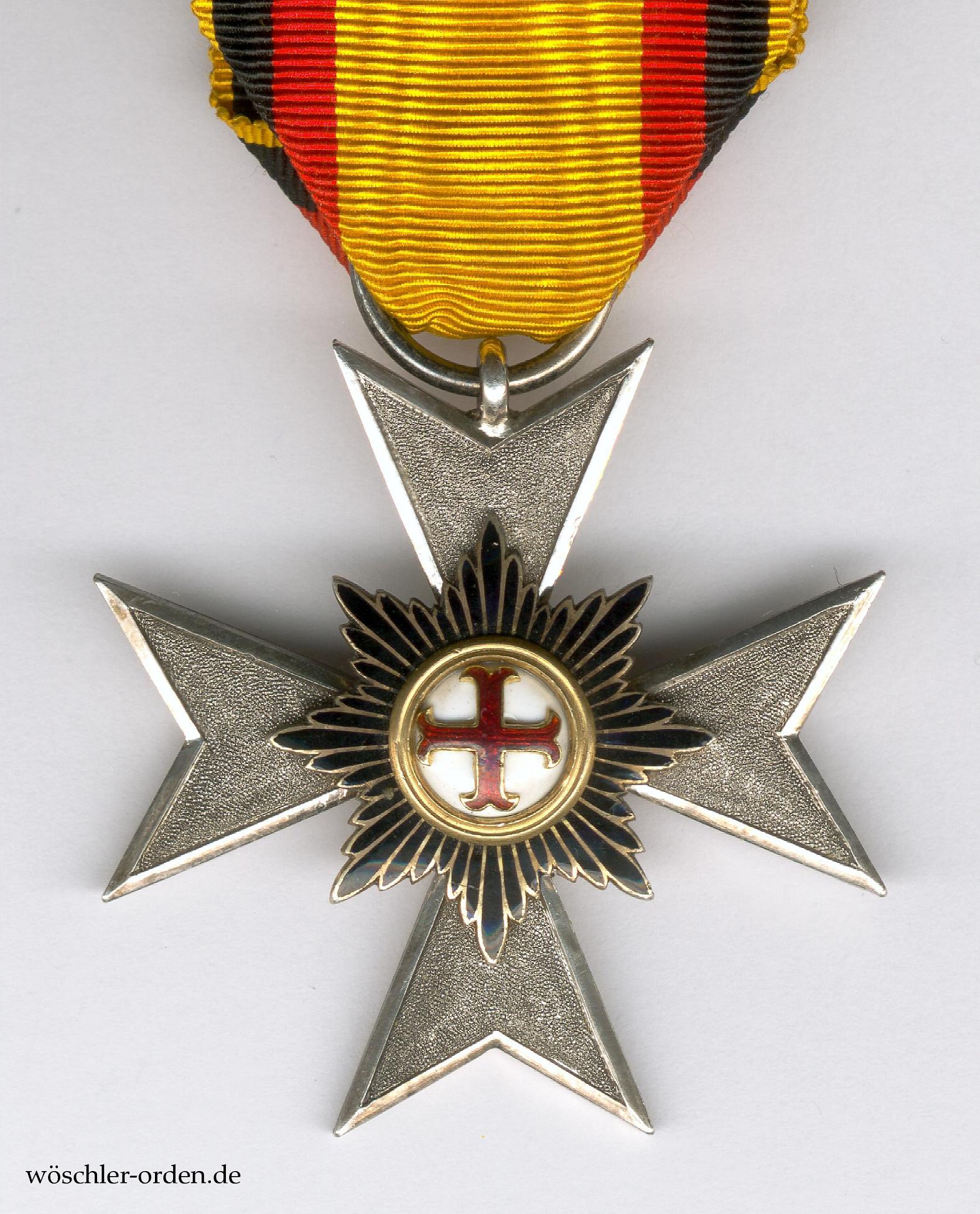 Exemplar mutmaßlich aus der Zeit des zweiten, anfangs vierklassigen Modells. Silber massiv geprägt, das Vorderseitenmedaillon mehrteilig in vergoldetem Silber und Emaille, das der Rückseite vergoldet. Ohne eine ersichtliche Herstellerbezeichnung. Insgesamt erfolgten 631 Verleihungen solcher Kreuze, davon 181 unter der älteren Bezeichnung bis 1896. Aktenkundig sind außerdem 172 Rückgaben nach dem Tod des Trägers oder nach Verleihung einer höheren Klasse.