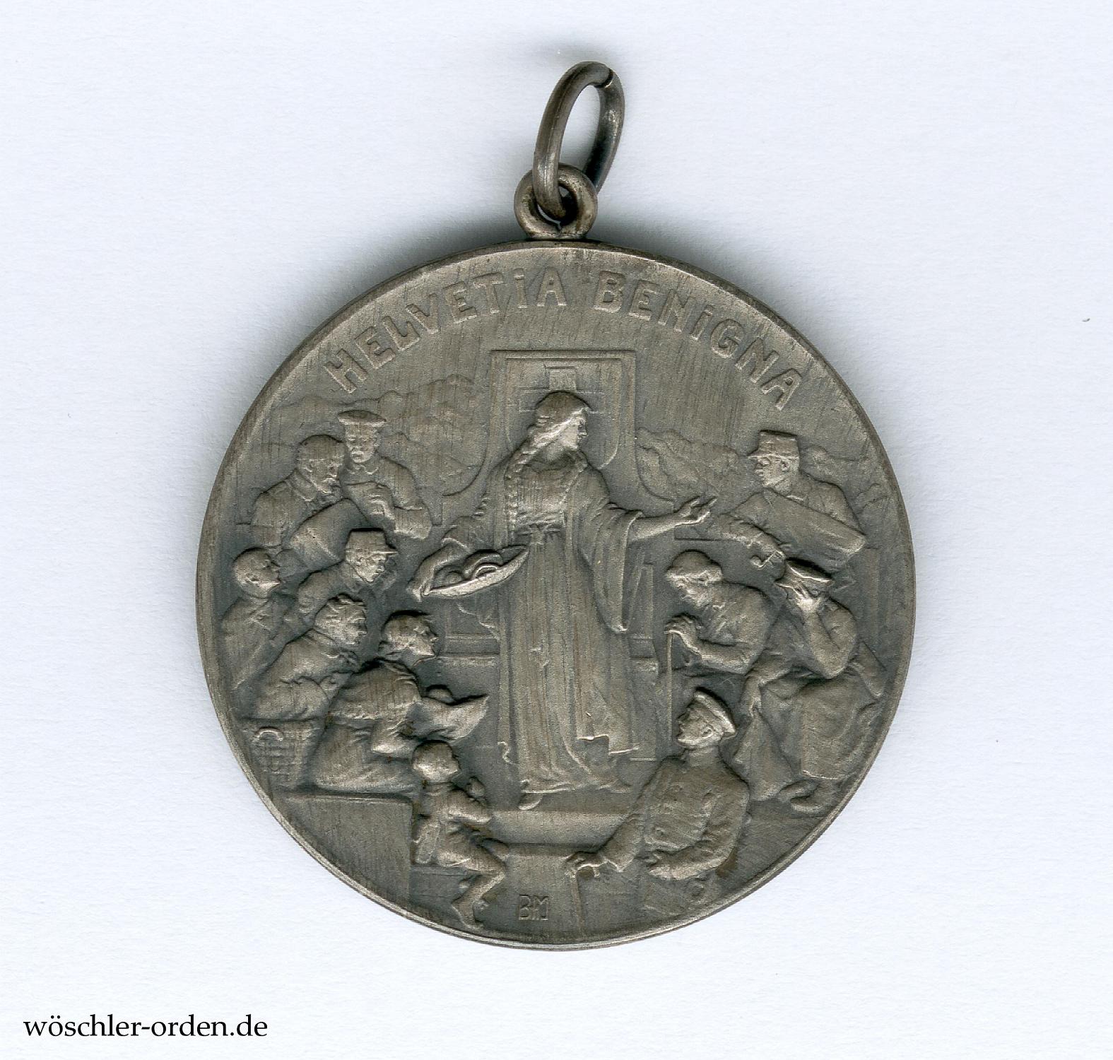 Die Umstände der Stiftung der Medaille „Helvetia Benigna“ konnten bislang nicht völlig geklärt werden. Wohl nach Anregung der Hof-Kunstprägeanstalt B. H. Mayer, die dem preußischen Kriegsministerium Entwurf und Modelle zur Verfügung stellte, wurden am 14. März 1917, bei einer Ausstellung von Arbeiten der in der Schweiz internierten Deutschen Kriegsgefangenen im Frankfurter Palmengarten, etwa 25 nichttragbare „Abschläge“ von 60 mm Durchmesser an geladene schweizerische Gäste durch Major Polenz vom preußischen Kriegsministerium vergeben. Veranstalter der Ausstellung war der „Ausschuß für Deutsche Kriegsgefangene in Frankfurt am Main“, der in der Folge eine kleinere Version, die als Anhänger und als Brosche vorkommt, an Schweizer und an in der Schweiz tätige Deutsche vergab. Zu Fertigungs- oder Vergabezahlen der kleinen Ausgaben können keine Angaben gemacht werden.