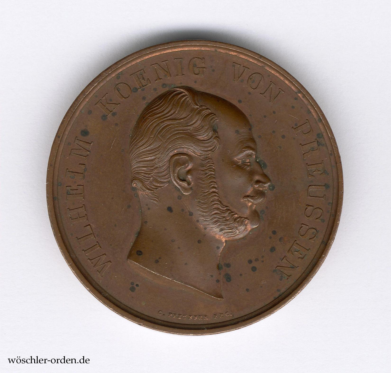 Bronzeabschlag des zweiten Modells, mit dem Portrait König Wilhelm I. Bronze geprägt, etwa 42 mm. Vorderseitig, unter dem Halsabschnitt, die Signatur „C. PFEUFFER FEC.“, rückseitig der auf einem Palmzweig sitzende preußische Adler, darunter klein die Signatur „C. P. FEC.“, jeweils für den Stempelschneider Carl Pfeuffer.