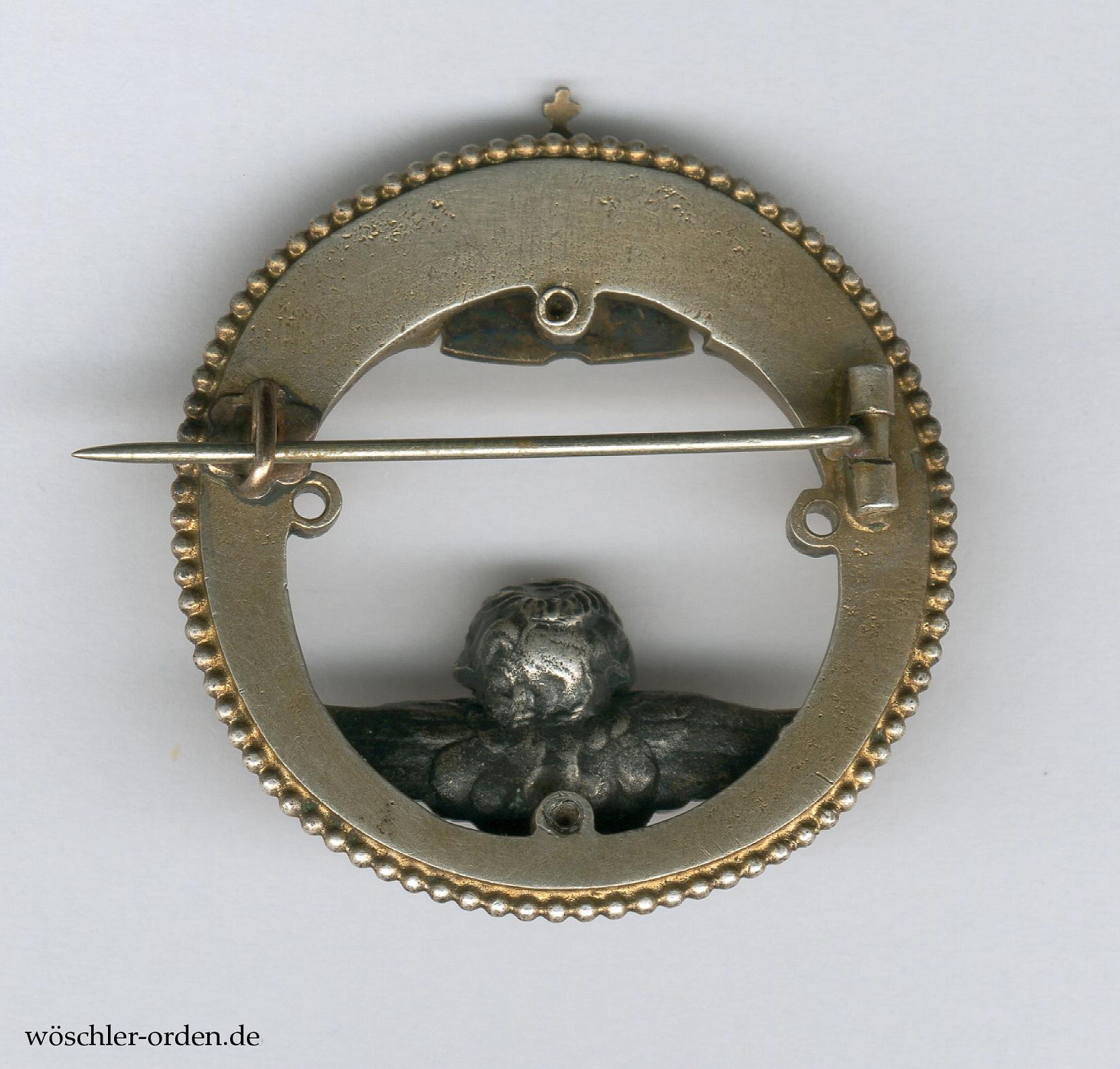 Das Bandeau mit der Zweckinschrift fehlt, außerdem die Vernietungen etwas locker, sodass die Krone ebenfalls wackelt. Der Nadelhaken sitzt auf einem ungewöhnlichen Plättchen und könnte ergänzt sein. Hiervon abgesehen in ordentlicher, getragener Erhaltung, mit insgesamt beriebener Vergoldung.