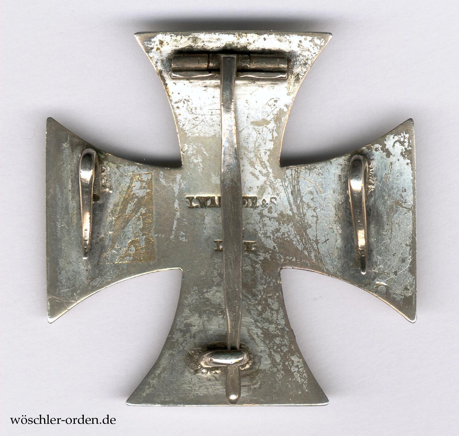 Verleihungsstück probemäßiger Fertigung der Hofjuweliere Johann Wagner & Sohn, Berlin, mit gegossenem und geschwärztem Eisenkern des sog. A-Typs aus Fertigung der Berliner Eisengießerei in Silberzarge. Rückseitig Nadelsystem mit einer abgeflachten Tragenadel, außerdem im Feld dreizeilig „I. WAGNER & S. / 14 / LÖTH:“ für den Hersteller sowie den verwendeten Silberfeingehalt punziert.