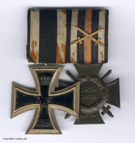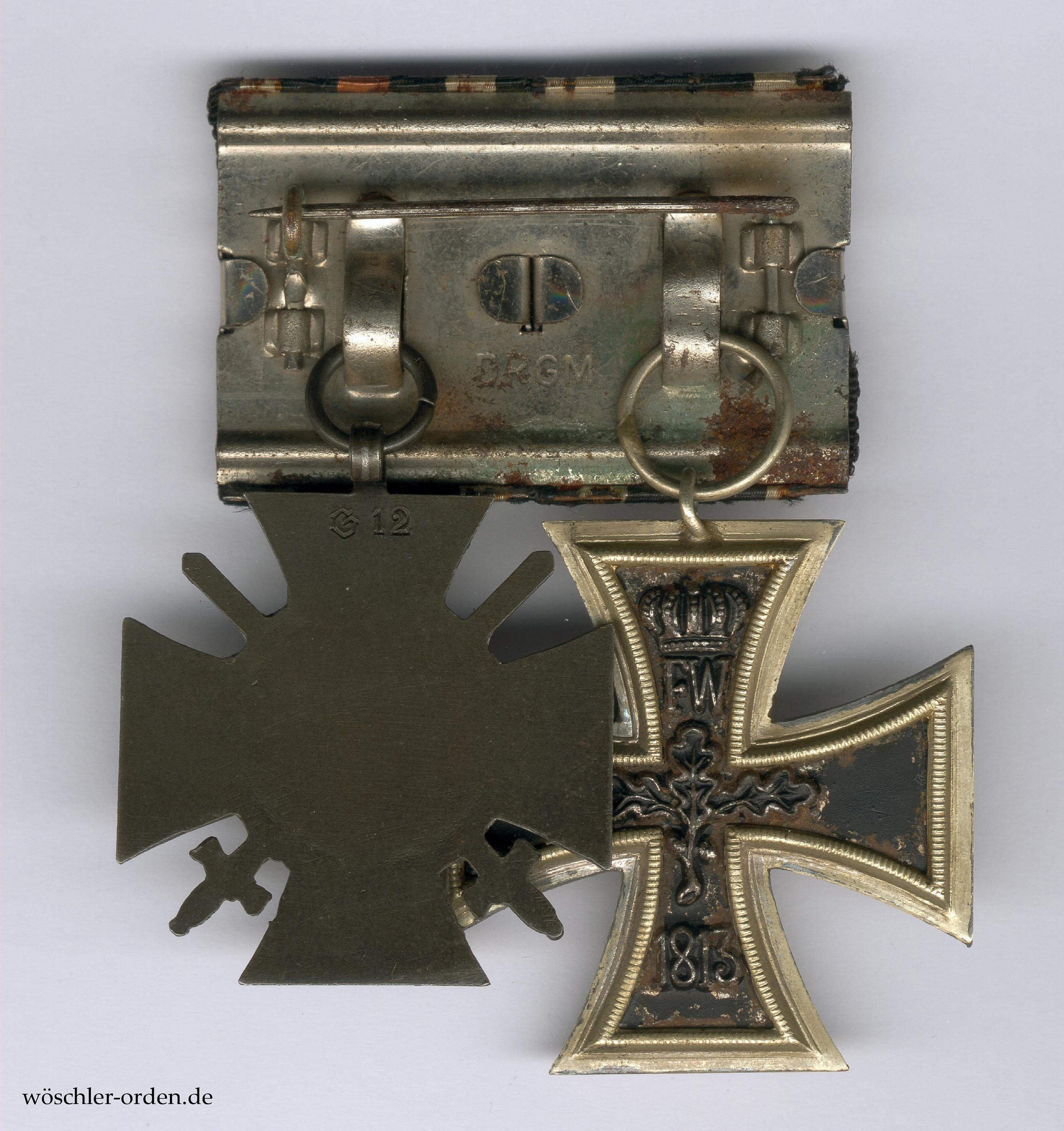 An 2-teiliger Großer Ordenschnalle zusätzlich mit einem Ehrenkreuz für Frontkämpfer, dieses rückseitig „G 12“ markiert. Die Ordenschnalle mit einfach konfektionierten Bändern, das des Frontkämpferkreuzes mit aufgelegten vergoldeten Schwertern. Rückseitig vernickeltes Trägerblech mit Musterschutzangabe „DRGM“ und einfacher Tragenadel.