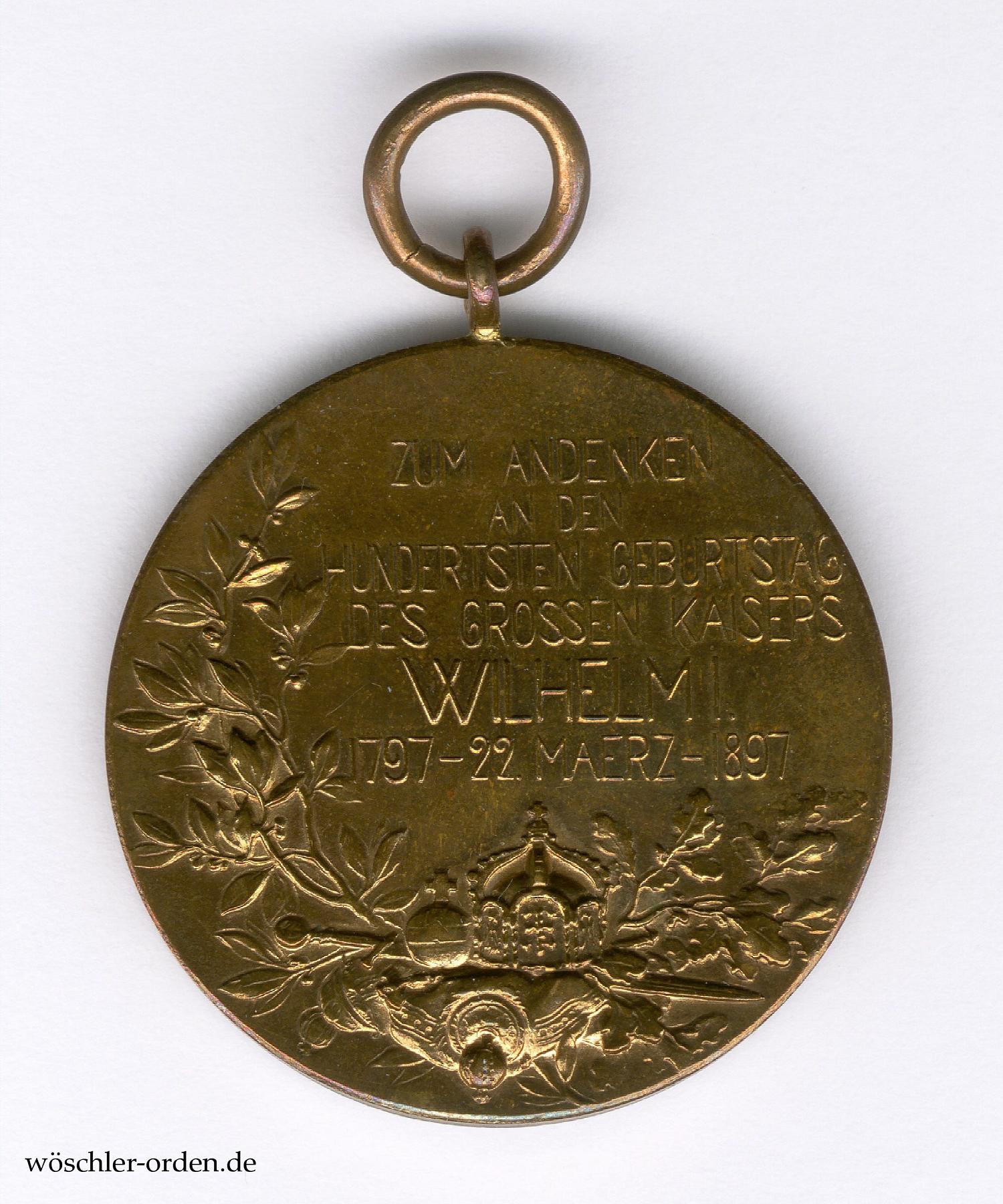 Die Erinnerungsmedaille wurde am 22. März 1897 von König Wilhelm II. zum Andenken an den 100. Geburtstag seines Großvaters, Wilhelm I., für sämtliche Offiziere, Militärbeamte, Unteroffiziere und Soldaten, welche an diesem Tage der aktiven (preußischen!) Armee oder den Reichstruppen angehörten, sowie für die Veteranen der Kriege von 1864, 1866 und 1870/71 gestiftet. Insgesamt wurden über 1,2 Millionen Medaillen verausgabt. Reduktionen waren recht beliebt, da sie mit den kleineren Kriegsdenkmünzen usw. besser im Gesamtbild der Großen Ordensschnalle korrespondierten. Da sie auf eigene Kosten zu beschaffen waren, sind sie trotzdem nicht allzu häufig.