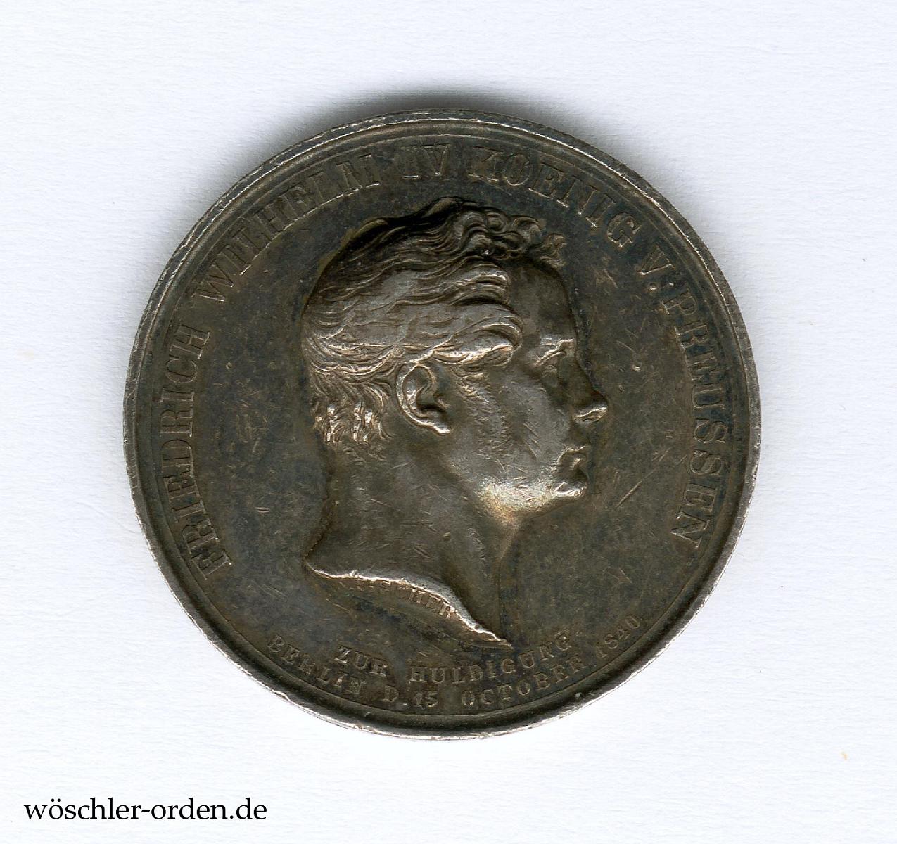 Silber, etwa 30,5 mm. Vorderseitig das nach rechts gewendete Kopfporträt König Friedrich Wilhelm IV. mit bogenförmiger Umschrift „FRIEDRICH WILHELM IV KOENIG VON PREUSSEN“. Unter dem Porträt zweizeilige, bogenförmige Umschrift „ZUR HULDIGUNG / BERLIN D. 15 OCTOBER 1840“. Im Halsabschnitt klein „K. FISCHER F.“ Rückseitig gekrönter Wappenschild mit dem preußischen Adler über einem fast verdeckten Eisernen Kreuz, darunter Zepter und Schwert, über dem Reichsapfel gekreuzt. Um den Schild ein Ring mit der Inschrift „SUUM CUIQUE“ im unteren Teil. Der Ring umgeben von der Kette des Hohen Ordens vom Schwarzen Adler mit acht Wappenschildern der Provinzen. Unten klein „C. PFEUFFER FEC.“ Referenz: Hüsken 7.176.