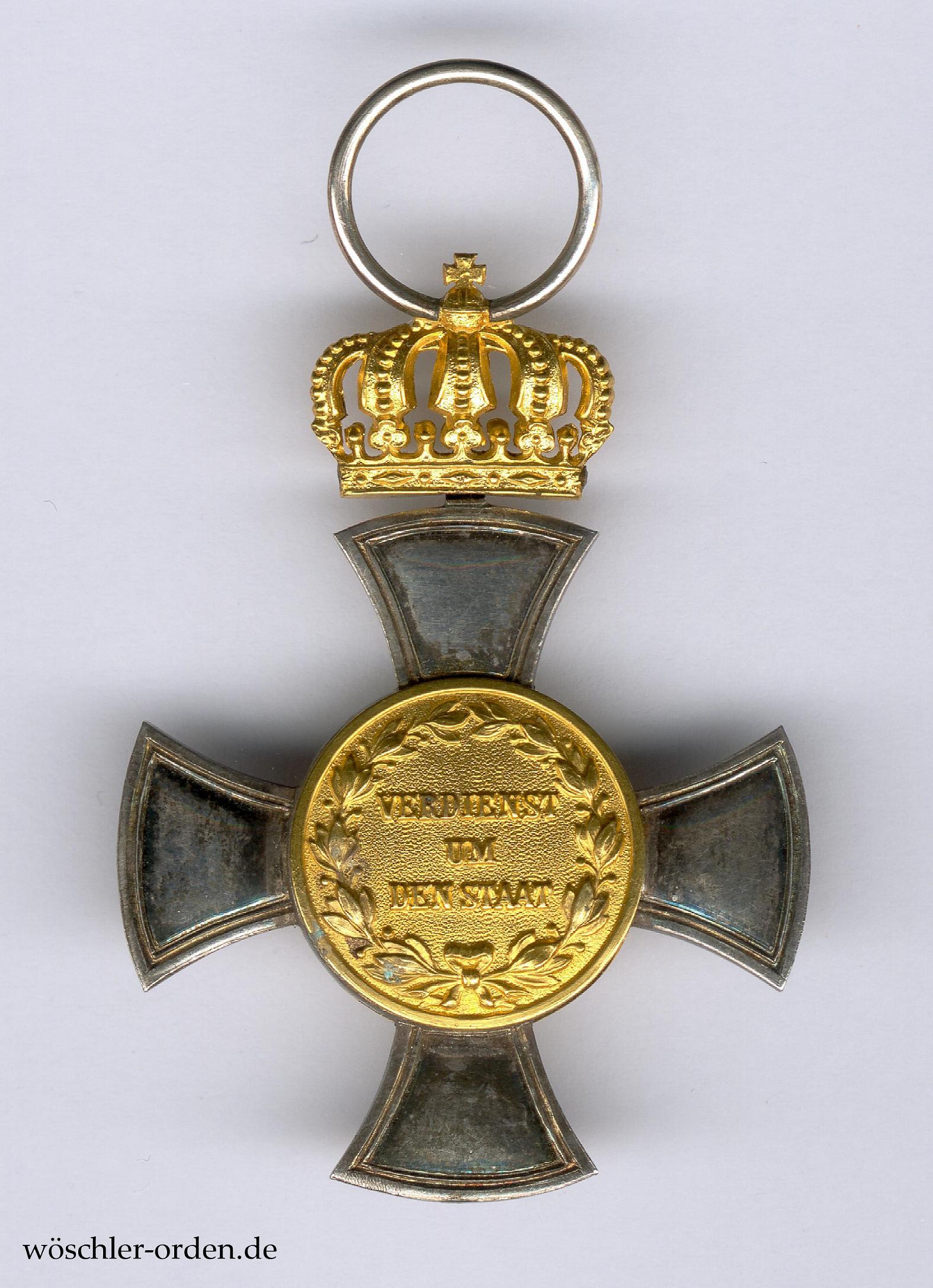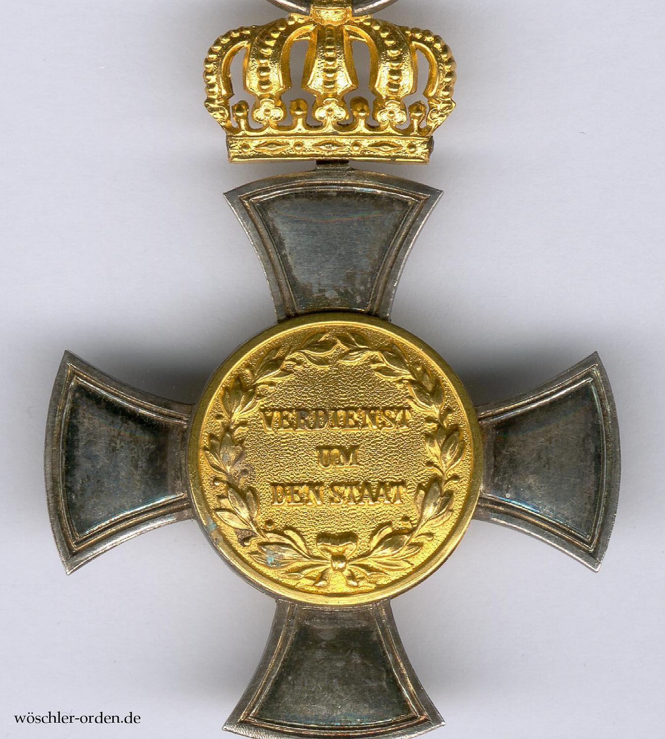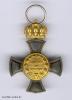 Silber geprägt, die Medaillons in Gold hohlgeprägt und verstiftet. Die „goldene Krone“ wohl in Doublé, beweglich befestigt und mit starrem Bandring. Im unteren Kreuzarm Ritzmarke „W“ für die Hofjuweliere Johann Wagner & Sohn, Berlin.