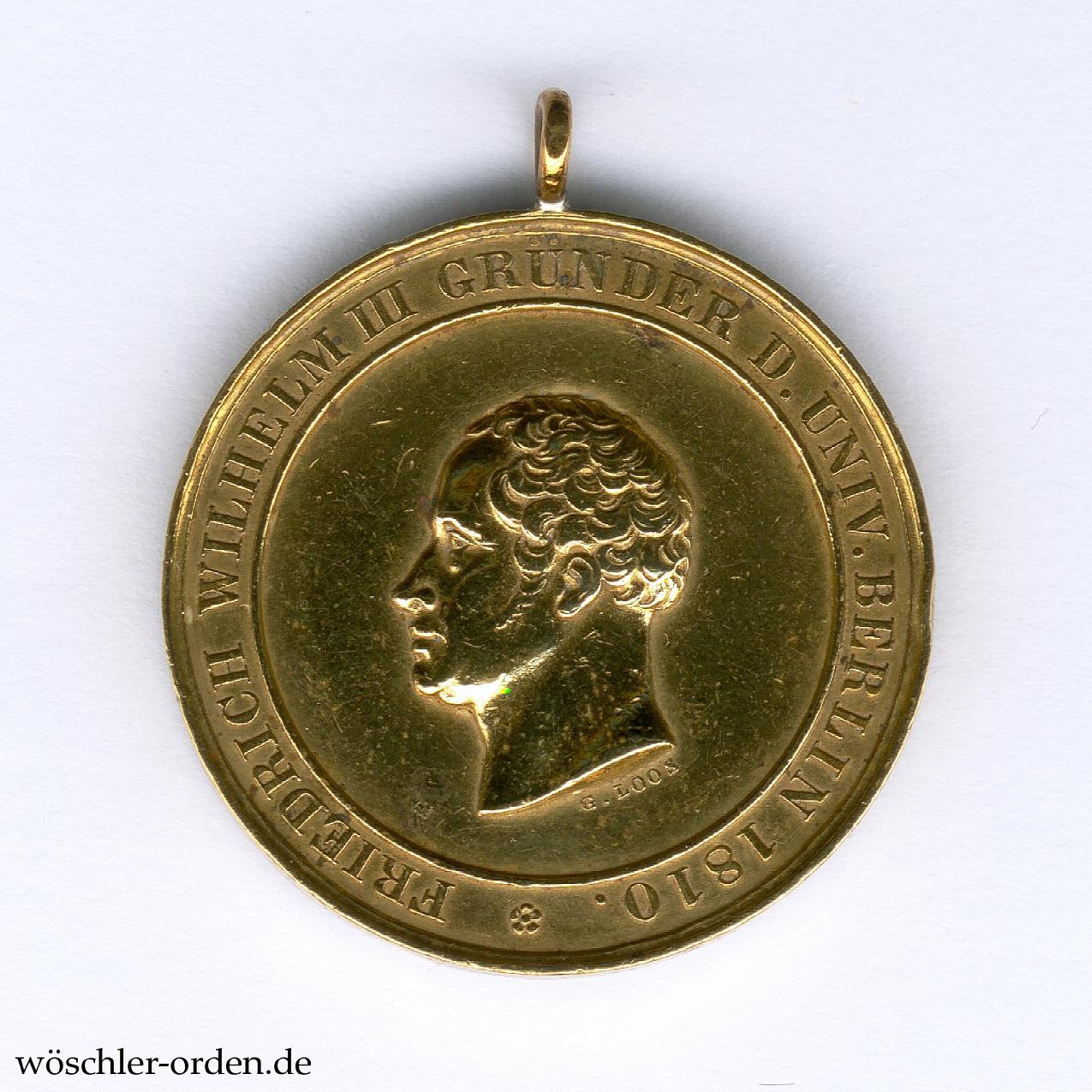 Bronze geprägt, etwa 30 mm, an einfacher Ringöse aus Draht. Vorderseitig Portrait des Gründers der Universität, König Friedrich Wilhelm III., nach links, am Halsabschnitt Signatur „G. LOOS“. Rückseitig Zweckinschrift in Lorbeerkranz.