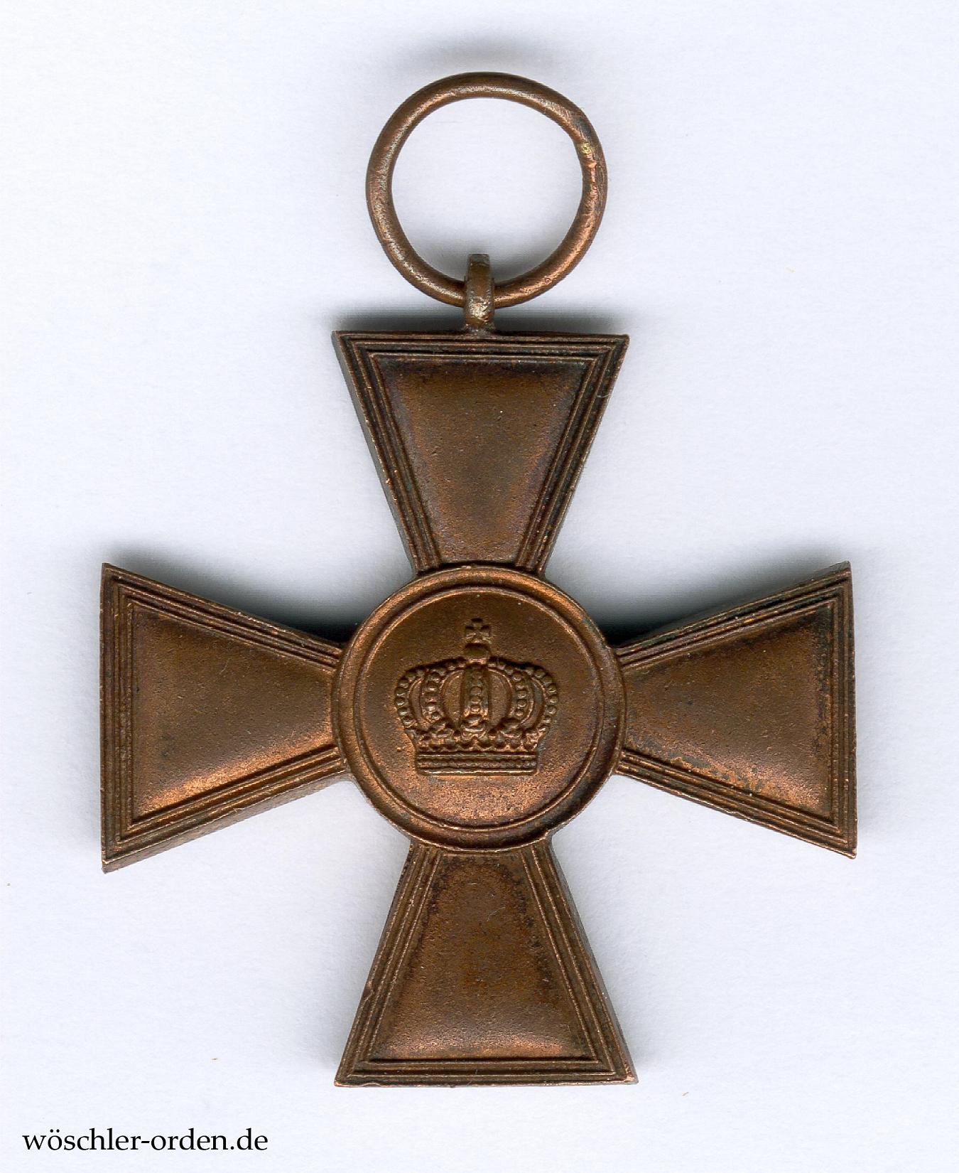 Exemplar des zweiten, ab 1913 verliehenen Modells, des Kreuzes für fünfzehn Dienstjahre. Wohl Kupfer geprägt und bronziert, an angelöteter Ringöse mit geschlossenem Bandring.