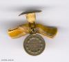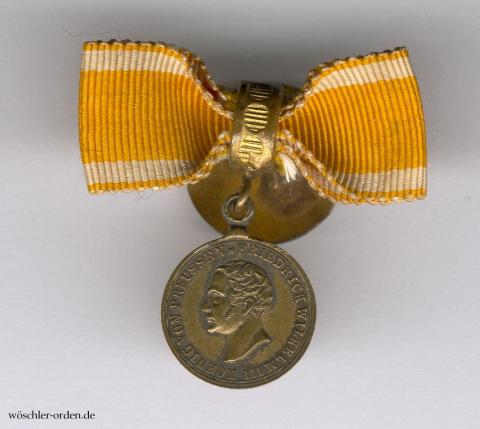 Miniatur, etwa 16 mm, des ersten, königlichen Modells. Buntmetall geprägt und versilbert, an angelöteter Parallelöse. An Einzel-Knopfloch-Dekoration mit konfektionierter Bandschleife, der Knopf selbst matt vergoldet und ohne eine Herstellerangabe.