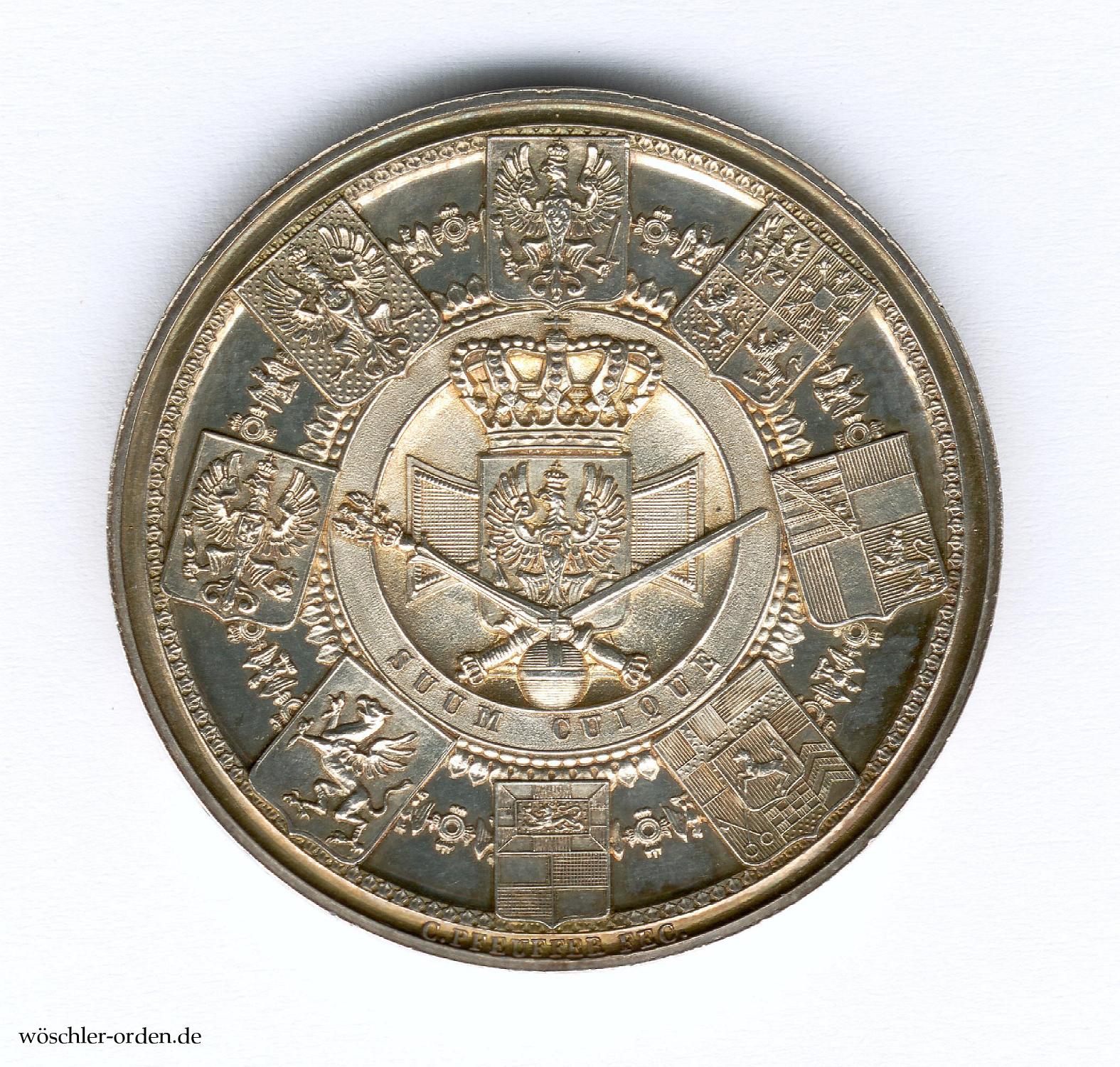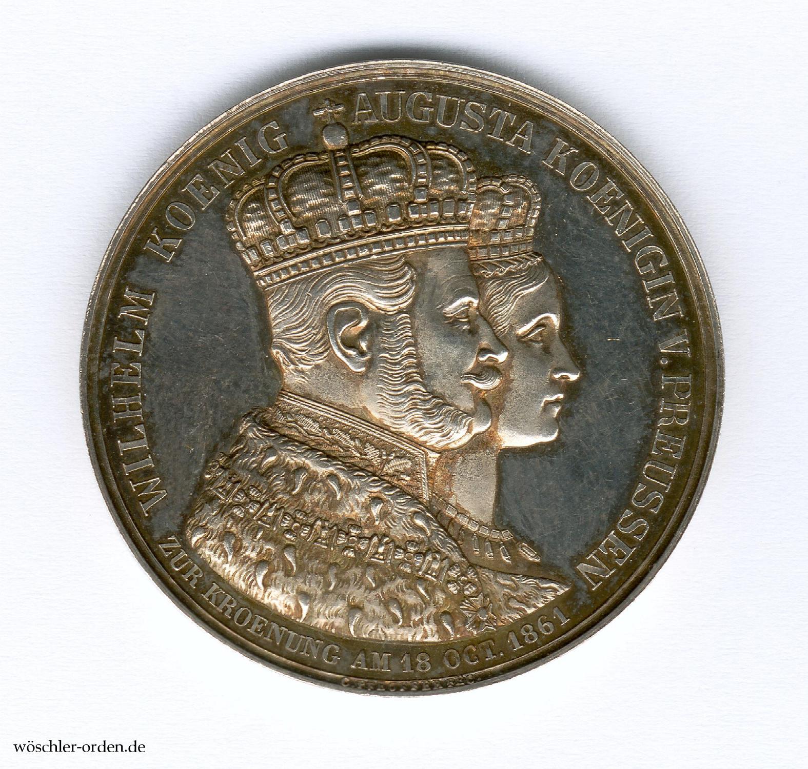 Silber geprägt, vorderseitig das nach rechts blickende, gekrönte Doppelportrait Wilhelm I. und Augustas im Ornat, mit Umschrift „WILHELM KOENIG AUGUSTA KOENIGIN V. PREUSSEN“, unten kleiner „ZUR KROENUNG AM 18 OCT. 1861“ sowie am Rand, ganz klein, die Signatur „C. PFEUFFER FEC.“ Rückseitig der gekrönte Wappenschild mit dem preußischen Adler über einem fast verdeckten Eisernen Kreuz, darunter Zepter und Schwert, über dem Reichsapfel gekreuzt. Um den Schild ein Ring mit der Inschrift „SUUM CUIQUE“ im unteren Teil. Der Ring umgeben von der Kette des Hohen Ordens vom Schwarzen Adler mit acht Wappenschildern der Provinzen. Unten wiederum klein „C. PFEUFFER FEC.“