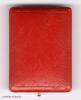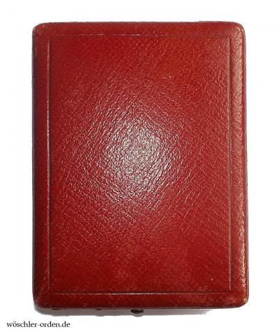 Leeres Verleihungsetui, mit rotem Leder bezogen und von einer eingeprägten Zierlinie auf dem Deckel abgesehen schmucklos. Innen eine altweiße Samteinlage mit einer Aussparung für die Dekoration, der Himmel, ebenfalls altweißer Seide, mit einer diagonal angebrachten Bandhalterung. Ohne jegliche Hersteller- oder sonstige Angaben wurden hierin die von den Hofjuwelieren J. Godet & Sohn, Berlin, gefertigten Kreuze ausgehändigt.