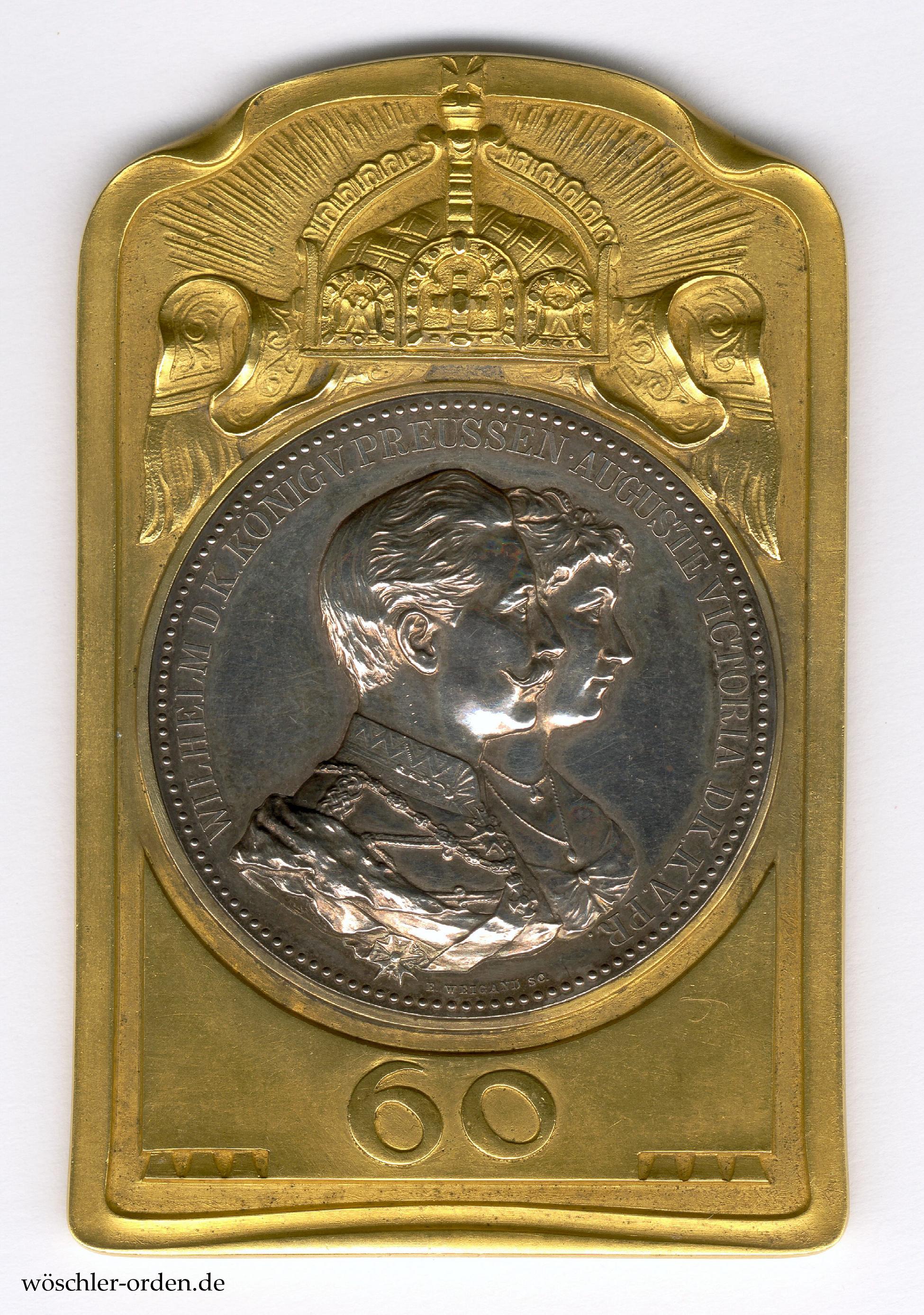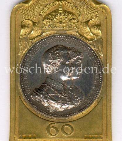 Feuervergoldete und ziselierte Bronzeplakette, etwa 56 mm x 87 mm, mit einer eingesetzten Silbermedaille zur goldenen Hochzeit, darüber Kaiserkrone, darunter die Jubiläumszahl „60“. Der Zierrahmen wurde von Prof. Emil Döpler d. J. gestaltet, die handwerkliche Ausführung übernahm der Ziseleur und Professor an der Schule des Königlichen Kunstgewerbemuseums Otto Rohloff. Gefertigt wurden zwischen 1899 und 1918 insgesamt 685 Exemplare, von denen 1918/19 wohl 25 Stück eingeschmolzen wurden.