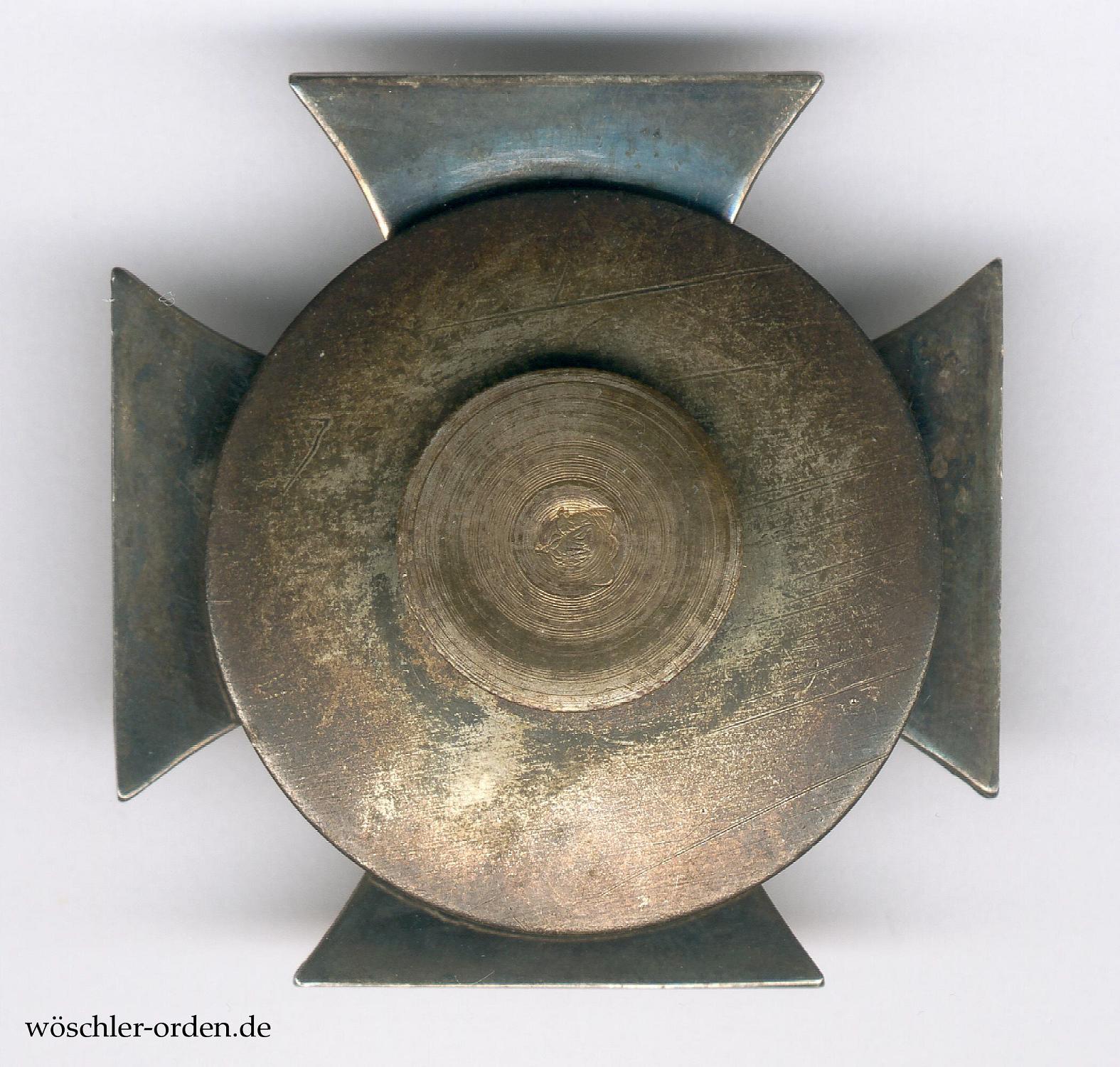 Mutmaßlich zeitgenössische, nichtprobemäßige Zweitfertigung, mit einem aus Eisen geprägten und wohl geschwärzten Kern in Silberzarge, diese rückseitig für den Feingehalt „925“ punziert. An Schraubbefestigung mit Gegenplatte, diese Teile allesamt unpunziert. Rückseitig, auf der Befestigungsschraube, die eingeschlagene Herstellerkennzeichnung der Kunstprägeanstalt A. Werner & Söhne, Berlin (AWES- bzw. Awes-Münze, auch „AWS“) in Form eines Wappens.