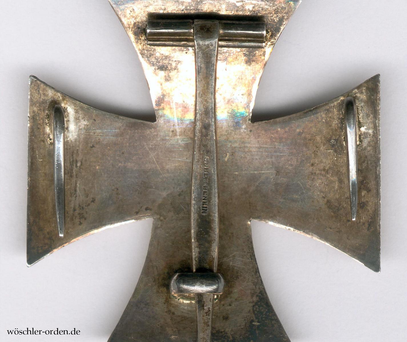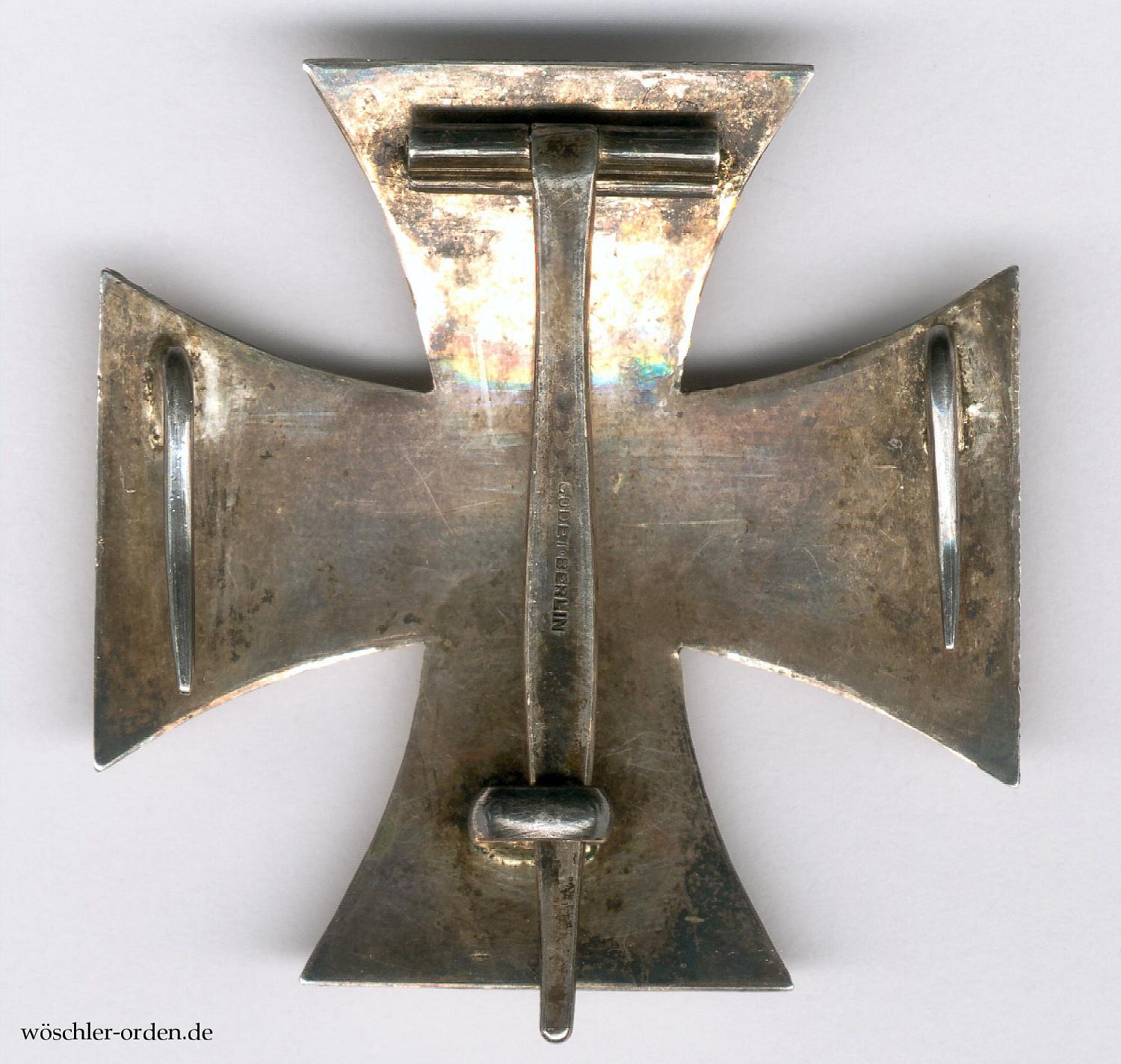 Wohl zeitgenössische, nichtprobemäßige Zweifertigung mit einem geprägten, mattschwarz lackierten Eisenkern in Silberzarge. Leicht gewölbte Ausführung an Nadel, mit zusätzlichen Haltehaken. Auf der Tragenadel Herstellerpunzierung „GODET - BERLIN“ der Hofjuweliere Jean Godet & Sohn, Berlin.