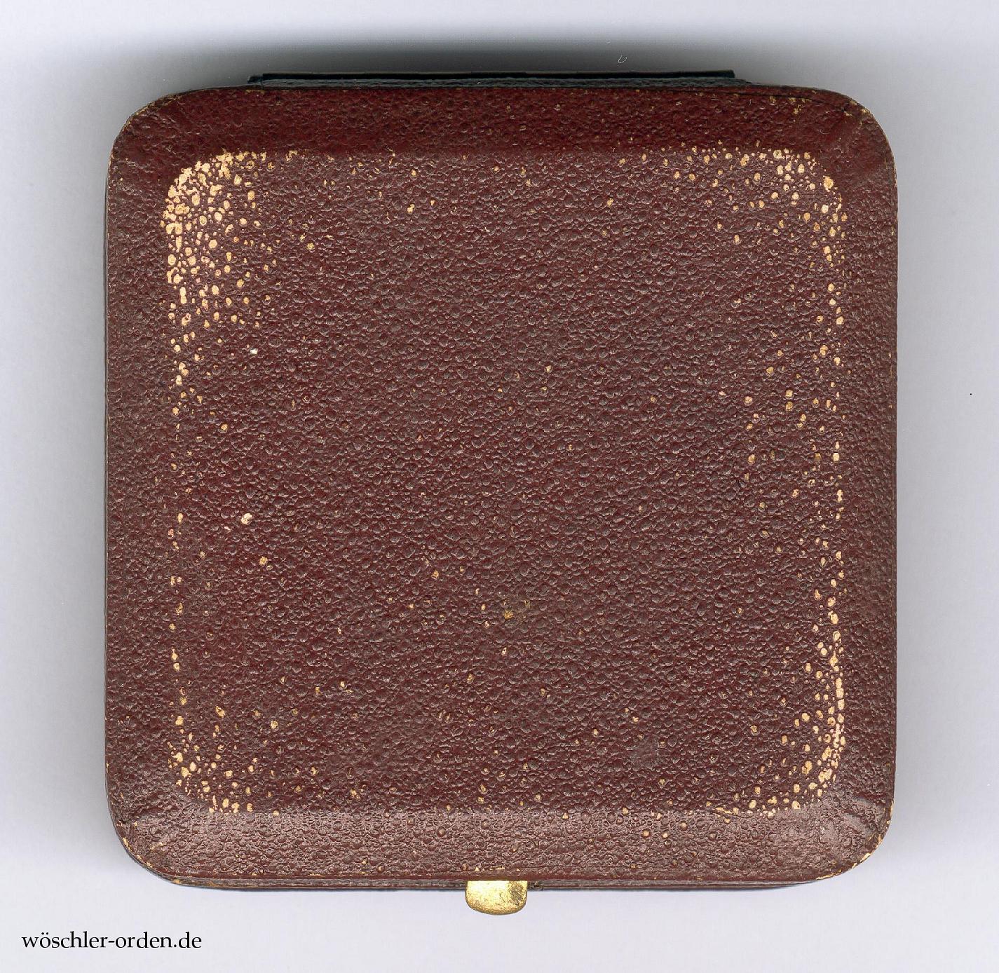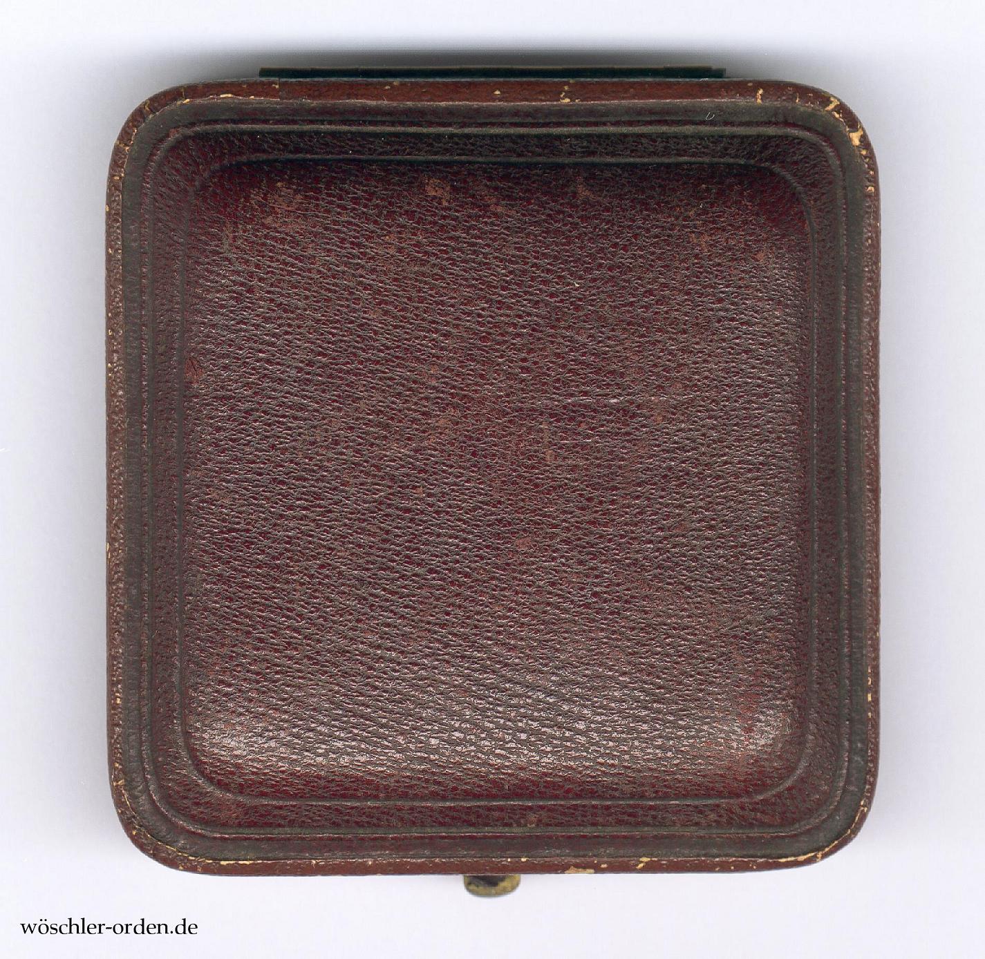 Dazu das mit weinrotem Leder und Lederimitat bezogene Verleihungsetui, der gewölbte Deckel schmucklos mit eingeprägten Zierlinien am Rand. Innen violette Samteinlage mit Aussparung für die Medaille, der Himmel in weißer Seide verkleidet.