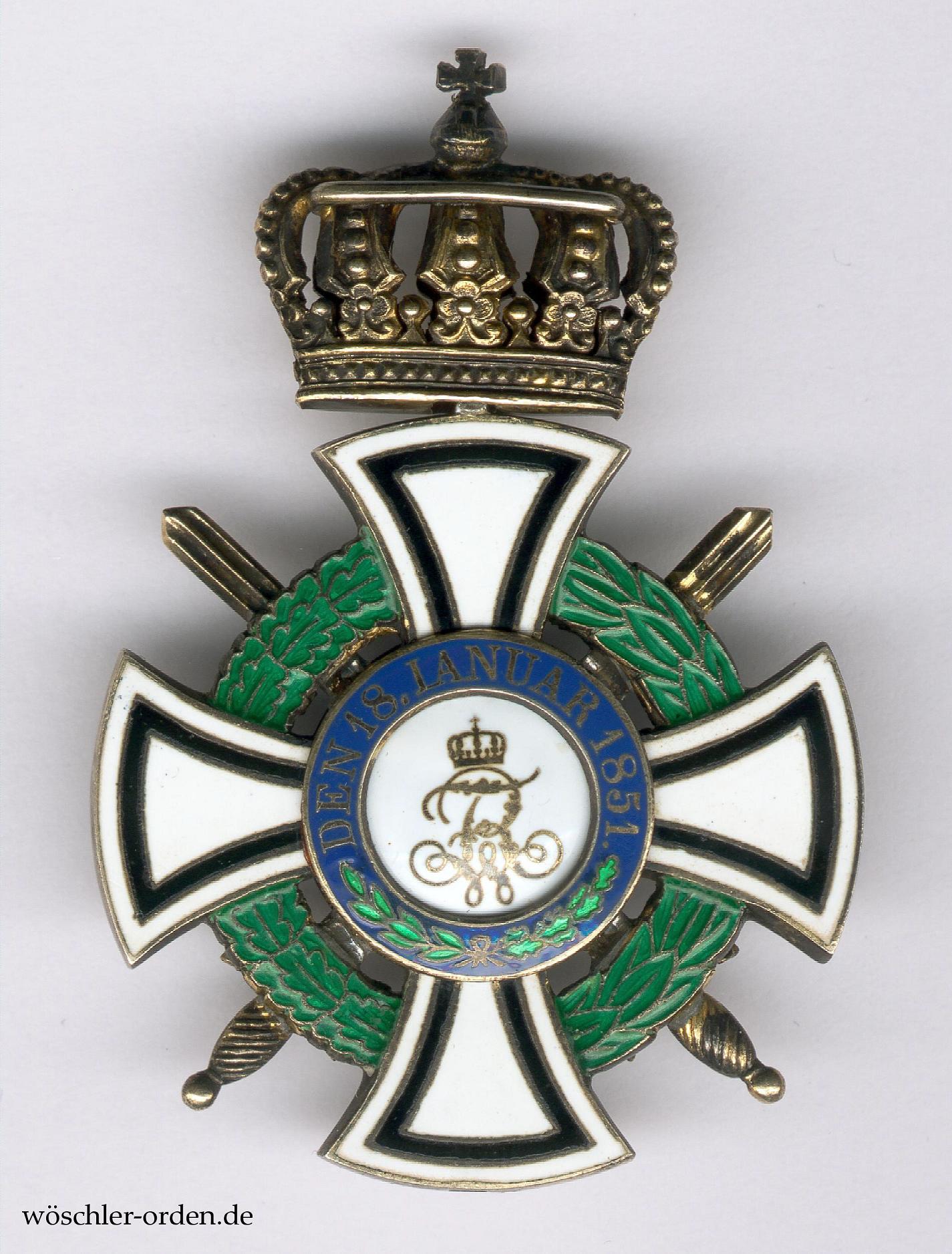 Der Königliche Hausorden von Hohenzollern wurde durch König Friedrich Wilhelm IV. am 18. Januar 1851 gestiftet, nachdem in Folge des Staatsvertrages vom 7. Dezember 1848 mit den Fürstentümern Hohenzollern-Sigmaringen und Hohenzollern-Hechingen auch deren Fürstlicher Hausorden in die Reihe der preußischen Orden überging. Der in ursprünglich drei Klassen – Großkomture, Komture und Ritter – neugestiftete Königliche Hausorden bestand aus zwei Abteilungen, deren erste, aus Kreuzen bestehend, für Verdienste um das Königliche Haus verliehen werden sollte. Die Dekorationen der zweiten Abteilung bestanden aus Adlern, sie waren „zur Belohnung besonderer Verdienste um die Pflege gottesfürchtiger und treuer Gesinnung unter der Jugend bestimmt“. Im Jahr 1861 wurden zusätzliche Bruststerne zu den Großkomturen und Komturen gestiftet, die regelmäßig als eigenständige Ordensstufen verliehen wurden, außerdem eine unterste, „Inhaber“ genannte Klasse für beide Abteilungen. Alle Klassen der ersten Abteilung konnten ab 1864 „für Verdienste vor dem Feind“ mit Schwertern verliehen werden, die in später verliehenen Friedensklassen als „Schwerter am Ringe“ dargestellt wurden. Grundsätzlich konnte der Orden mit Dienstaltersabzeichen, den sog. Jubiläumszahlen, verliehen werden.