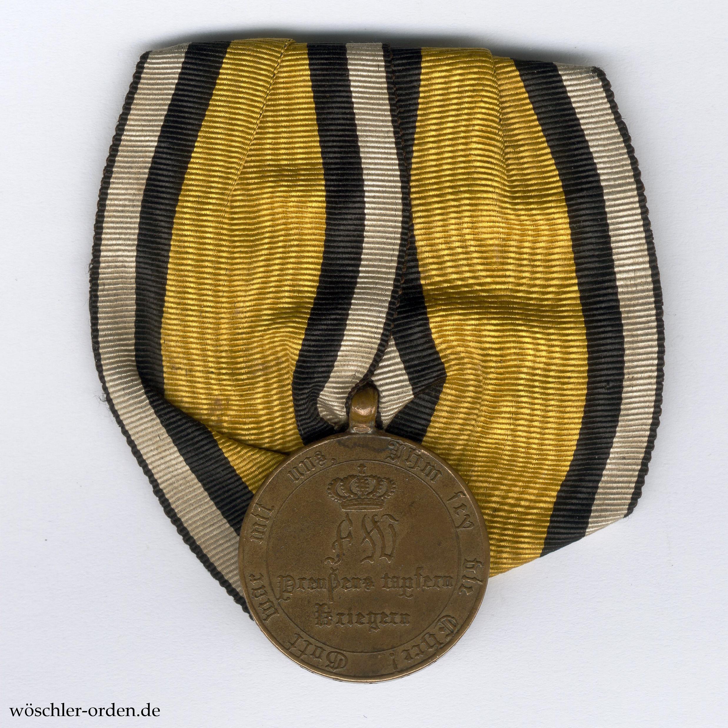 König Friedrich Wilhelm III. stiftete die Kriegsdenkmünzen für die Befreiungskriege bereits am Heiligen Abend 1813, insoweit spontan und improvisiert, als dass das genaue Aussehen der Medaillen oder Bänder noch nicht feststand. Die Gestaltung der Medaillen wurde wohl erst Mitte 1814 realisiert, nachdem der zweite Sohn des Königs, der spätere König und Kaiser Wilhelm I., im März 1814 das Band unter Verwendung schwarzen und weißen Papieres sowie eines orangen Streifens seiner SAO-Schärpe entwarf. Die Medaillen für „1813“, „1813 – 1814“ und „1814“ wurden dann Mitte 1814 in Paris geprägt, wobei die Ausführung der Vorderseite nicht den Beifall des Königs fand. Trotzdem wurden diese Medaillen, preußischer Sparsamkeit entsprechend, verausgabt und die fehlerhafte Interpretation des Entwurfs erst bei der zweiten, in Berlin geprägten Serie angepasst, weswegen es die nachgestiftete Medaille für 1815 nur in der Ausführung mit den „geraden“ Kreuzarmenden gibt.