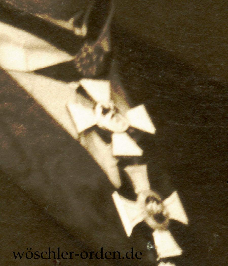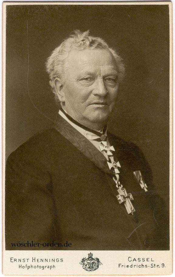 Er trägt am Hals die II. Klasse mit Eichenlaub mit Dienstaltersabzeichen 50 des Roter-Adler-Ordens, die II. Klasse des Königlichen Kronenordens sowie ein großes Pektorale, außerdem auf der Brust, als 1er Ordensschnalle, ein Ritterkreuz des Großherzoglich Hessischen Verdienst-Ordens Philipps des Großmüthigen.