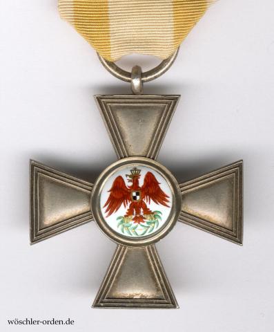 Exemplar aus der Zeit des fünften und endgültigen, ab 1854 verliehenen Modells mit der ziegelroten Adlermalerei, in der ersten, bis 1885 verliehenen Ausgabe mit den glatten Flächen der Kreuzarme. Silber, das Medaillon emailliert. An der Kante des unteren Kreuzarmes die Ritzmarke „W“ der Hofjuweliere Johann Wagner & Sohn, Berlin.