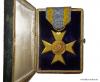 Das Kreuz in guter, wenig getragener und unbeschädigter Erhaltung, an etwa 13 cm langem, vorderseitig etwas verblasstem Band. Das Etui mit merklichen Alters- und Gebrauchsspuren.
