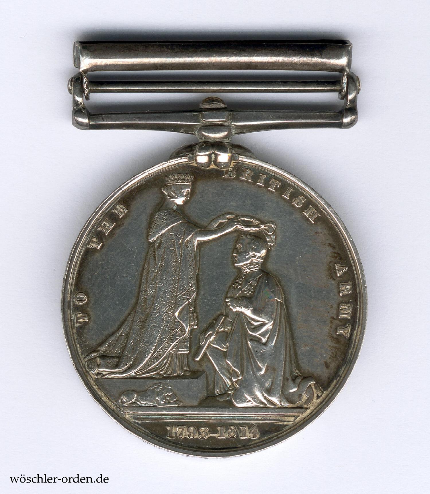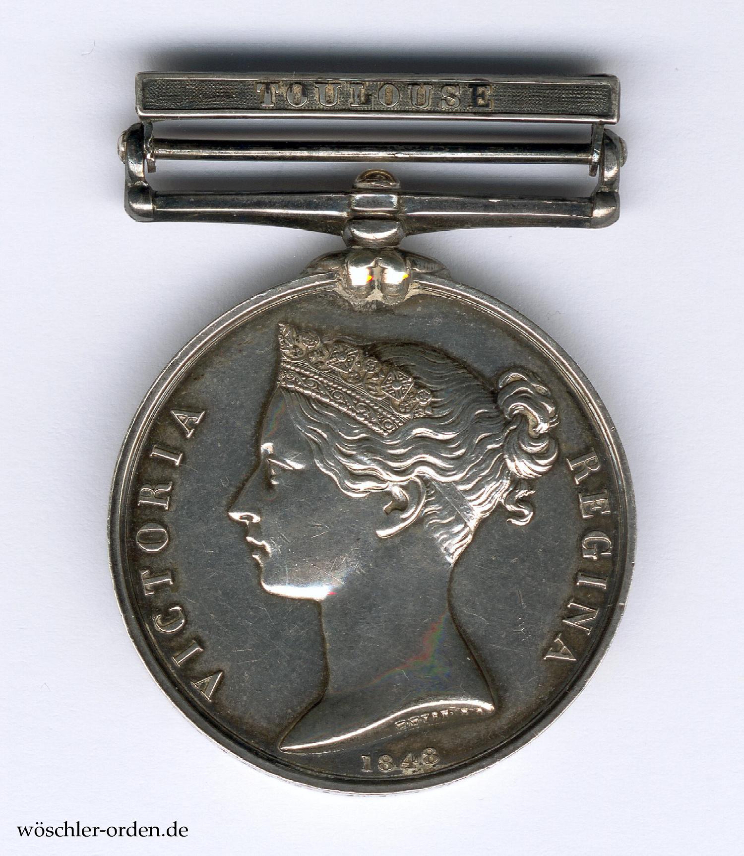 Silber geprägt, vorderseitig das Portrait der Königin Victoria nach links mit der Umschrift „VICTORIA REGINA“ und das Erstverleihungsjahr „1848“ zeigend. Die Rückseite stellt in Ganzfiguren die Königin Victoria, wie sie den knienden Herzog von Wellington mit einem Lorbeerkranz krönt, mit der Umschrift „TO THE BRITISH ARMY“ und den Jahreszahlen „1793–1814“, dar. Der Entwurf stammte von William Wyon. An starr befestigter Zieröse mit beweglich verschraubter Trageagraffe für das Band, hieran ebenfalls beweglich die Gefechtsspange „TOULOUSE“ befestigt.