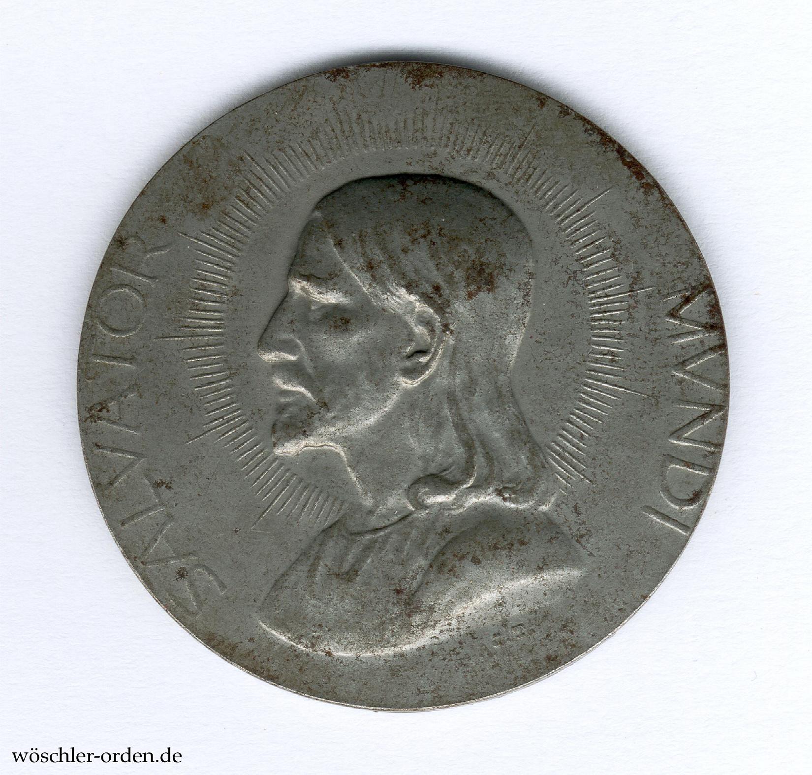 Eisen geprägt, etwa 40 mm. Vorderseitig Christusportrait nach link mit Umschrift „SALVATOR / MUNDI“ und Signatur „J. T.“, rückseitig Wiener Ansicht mit ebenfalls lateinischer Inschrift, unten Signatur „J. TAUTENHAYN / FECIT 1917“.