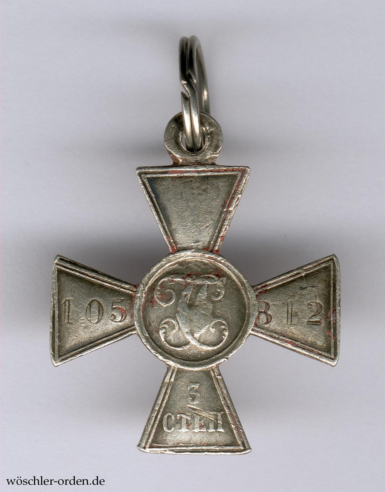 Das St.-Georgs-Soldatenkreuz wurde am 13. Februar 1807 durch Alexander I. unter dem Namen „Ehrenzeichen des Militärischen Ordens“ als dem bereits 1769 durch Katharina II. gestifteten St.-Georgs-Orden affiliiertes Ehrenzeichen in ursprünglich einer Klasse gestiftet. Unter Alexander II. wurde es am 19. März 1856 auf vier Klassen, die sich durch Material (Gold oder Silber) und Trageweise (Band mit oder ohne aufgelegte Schleife) unterscheiden, erweitert. Mit den neuen Ordensstatuten vom 10. August 1913 erhielt es den Namen „Georgs-Kreuz“. Da jedes Kreuz über eine eingravierte Matrikelnummer verfügt, sind sie theoretisch ihrem einstigen Träger zuordenbar. Tatsächlich haben sich die entsprechenden Unterlagen jedoch nur zum Teil bis heute erhalten.