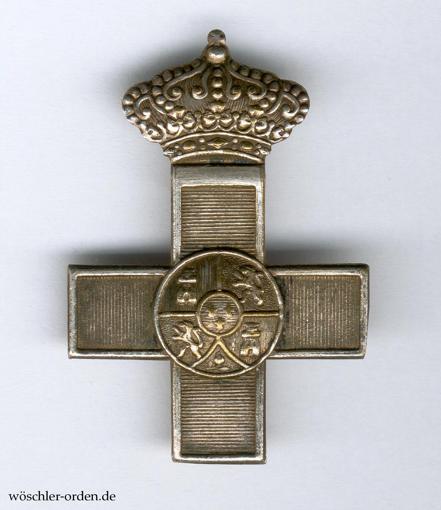 Exemplar wohl aus der Zeit des sechsten, von 1875 bis 1931 verliehenen Modells des Fünften Spanischen Königreiches. Buntmetall, wohl Bronze, einteilig hohl geprägt und versilbert, die Krone mit angelötetem Ringchen.