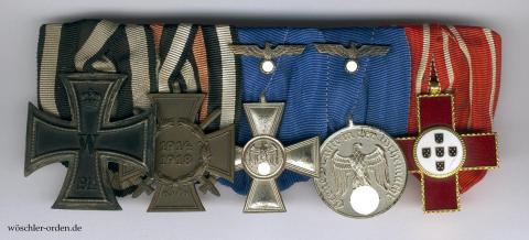 Deutsches Reich, 5-teilige Große Ordensschnalle eines Veteranen des Ersten Weltkrieges und Berufsoldaten der Wehrmacht, wohl Heer oder eventuell Kriegsmarine, möglicherweise eines Sanitätsoffiziers, mit den folgenden Auszeichnungen: