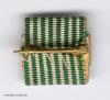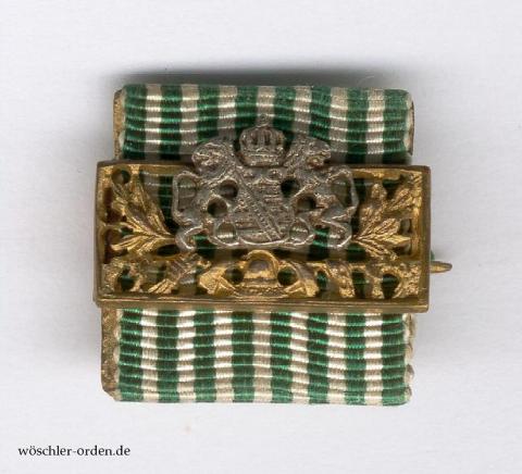 Miniatur im Stil des Originalabzeichens, also mit einem durchgezogenen Band und mit einer rückseitigen Tragenadel. Buntmetall, mehrteilig gefertigt und vergoldet bzw. teils versilbert.