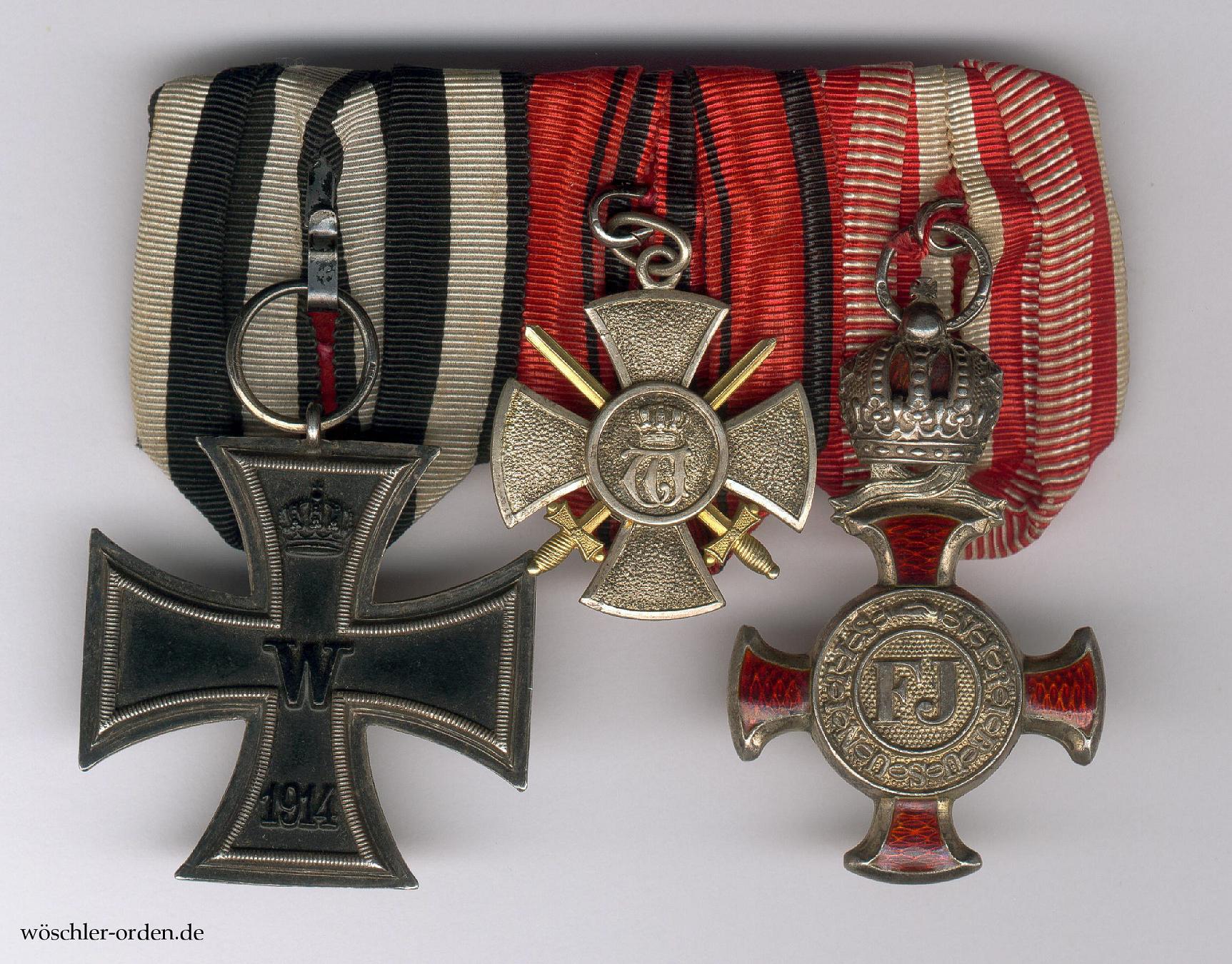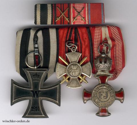 Königreich Württemberg, 3-teilige Große Ordensschnalle eines Unteroffiziersdienstgrades und Weltkriegskämpfers, mit den folgenden Auszeichnungen: