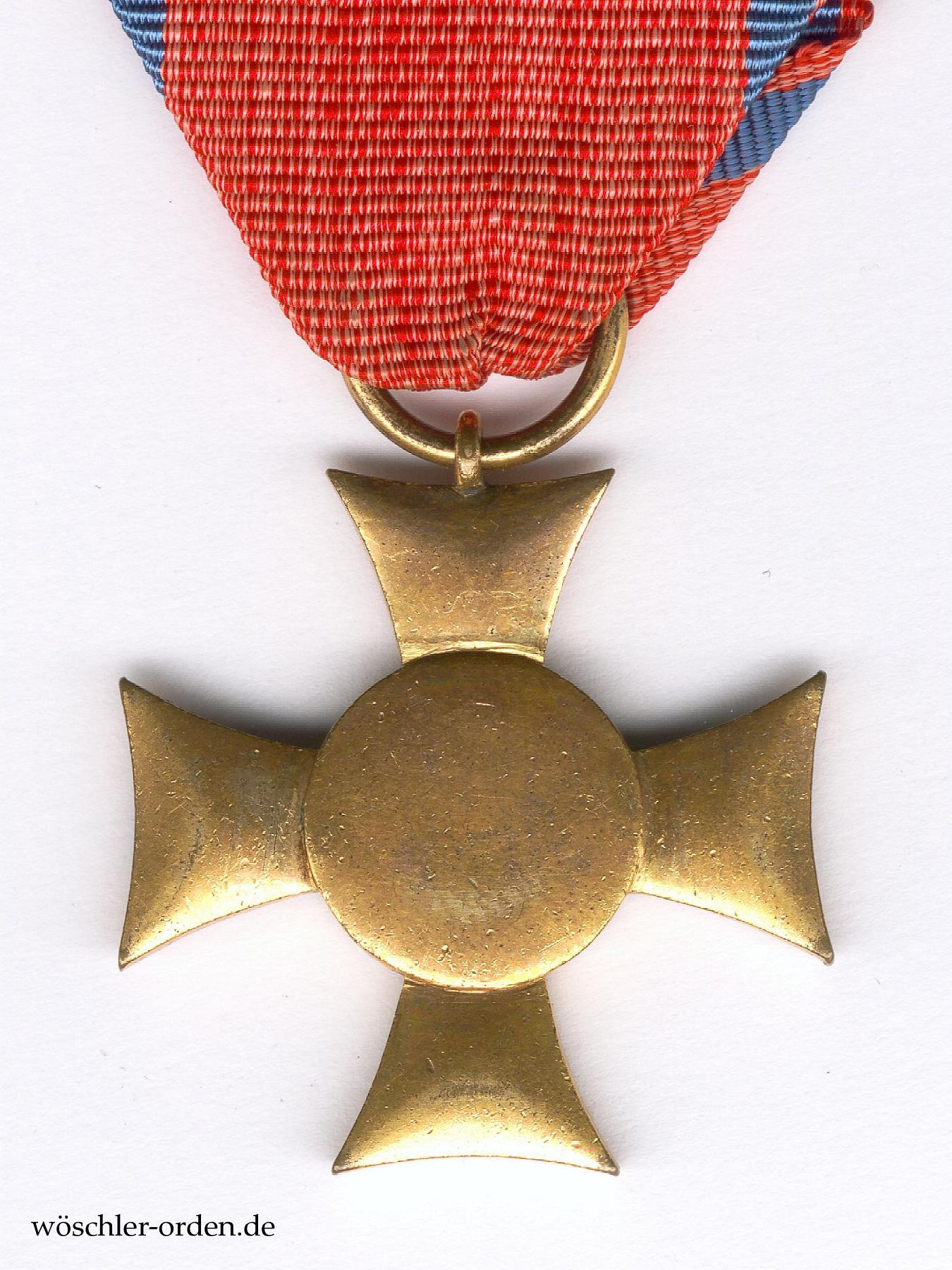 Exemplar der zweiten, etwa 1850 bis 1864 verliehenen Ausgabe, mit querstehender Ringöse. Bronze mehrteilig gefertigt und vergoldet, die vorderseitigen Flächen der Kreuzarme wohl gestichelt. Der Lorbeerkranz im Medaillon wohl in Gold und Emaille. Die Rückseite recht flach gearbeitet und ohne die scheinbar üblichere rückseitig offene Vernietung.