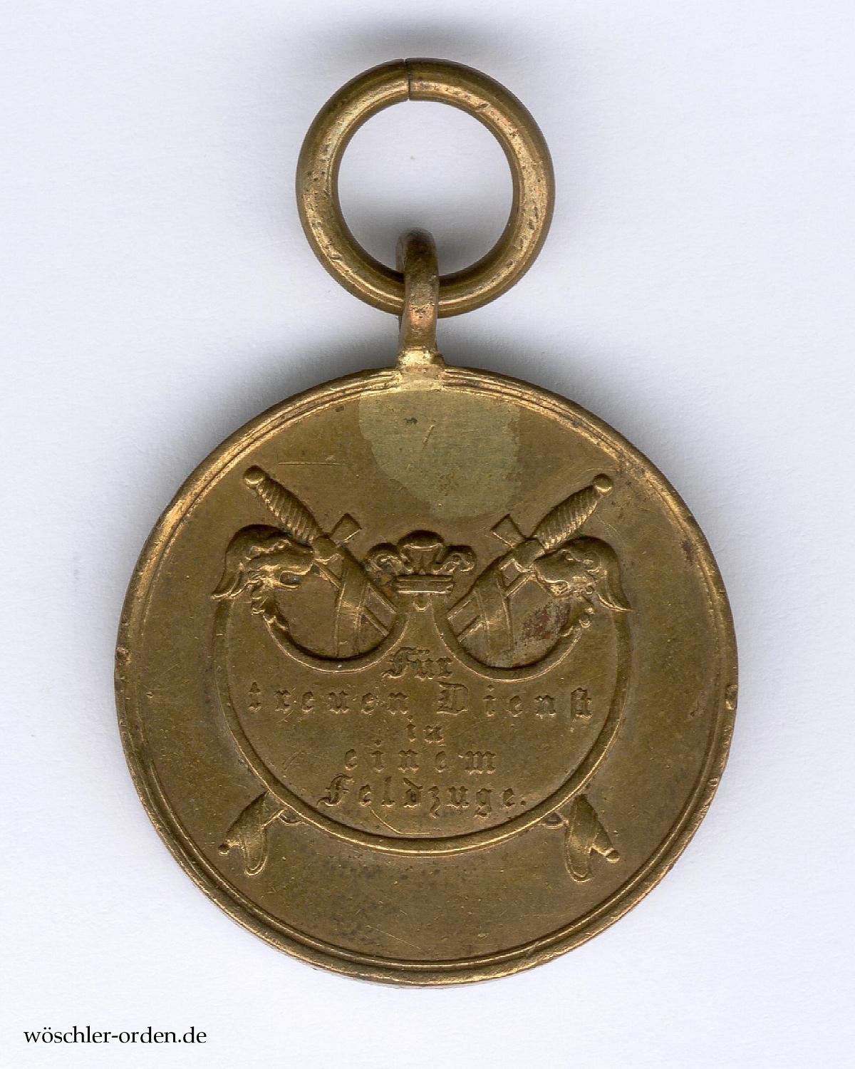 Ausgabe „Für treuen Dienst in einem Feldzuge“. Bronze geprägt, an stabiler, angelöteter, Ringöse mit einem offenem, ebenfalls stabilen Bandring. Exemplar mit, nach Klein und Raff, Stempelkopplung „1/1“, also der unsignierten Vorderseite und der Rückseite mit der kleineren Schrift.