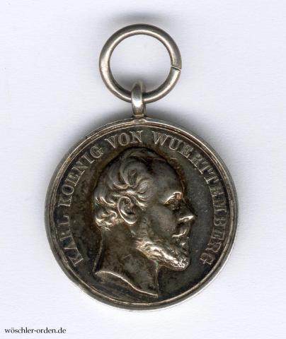 Exemplar des dritten, ab 1865 verliehenen Modells mit dem Portrait des Königs Karl, in der zweiten, von 1879 bis 1891 geprägten Ausgabe ohne die Signatur des Stempelschneiders. Von dieser Ausgabe wurden insgesamt 1835 Exemplare geprägt. Silber, an angelöteter, stabiler Ringöse mit offenem Bandring.