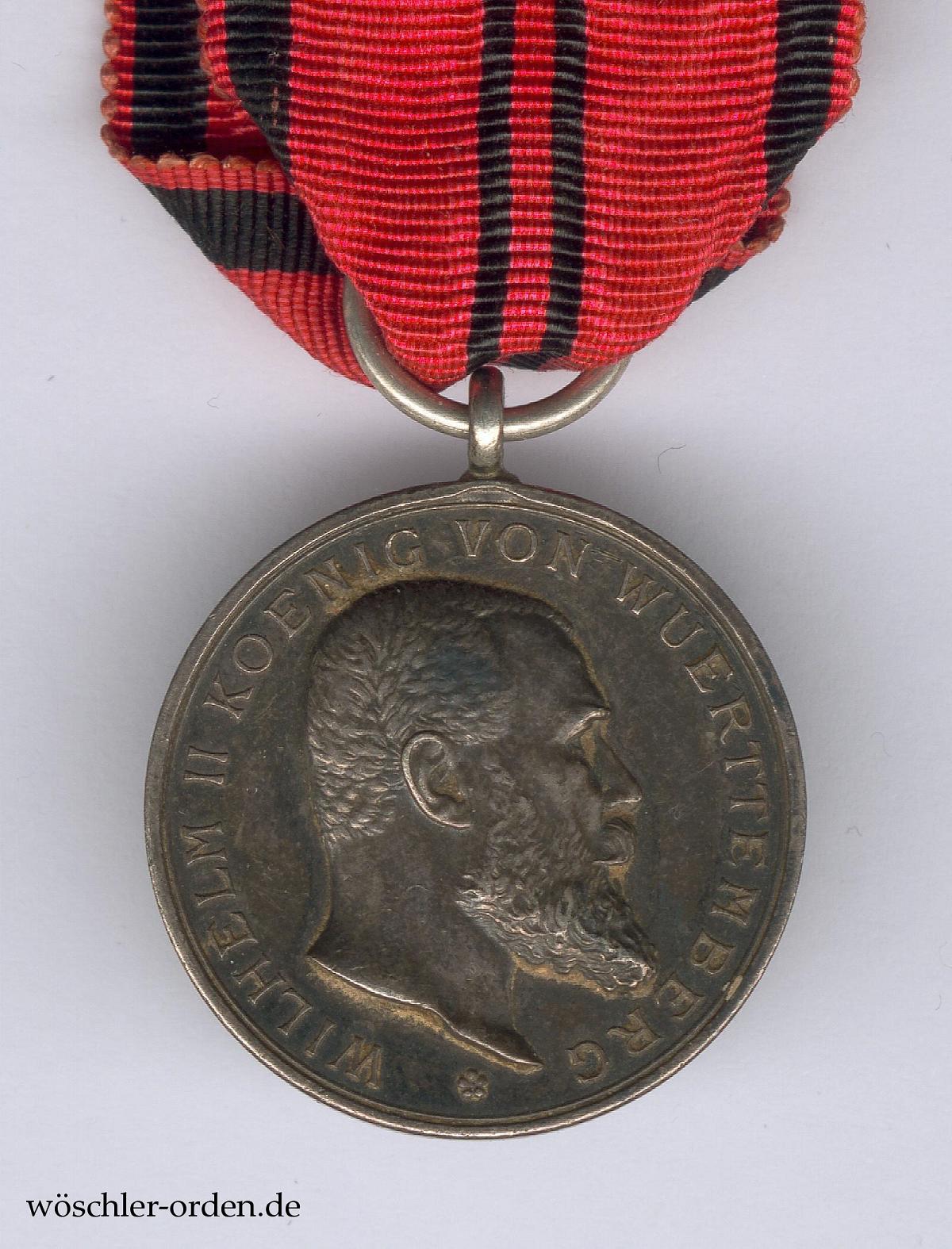 Exemplar des fünften und letzten, unter der endgültigen Bezeichnung verliehenen Modells, mit dem Portrait König Wilhelm II. und der Rückseite mit dem lichten Eichenlaubkranz. Silber geprägt, an angelöteter Ringöse mit offenem Bandring. Insgesamt wurden durch das Stuttgarter Münzamt 10.717 Medaillen geprägt, davon 8050 im Feingehalt 993/000.