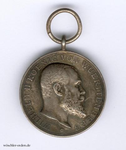 Exemplar des fünften und letzten, unter der endgültigen Bezeichnung verliehenen Modells, mit dem Portrait König Wilhelm II. und der Rückseite mit dem lichten Eichenlaubkranz. Silber geprägt, an angelöteter Ringöse mit offenem Bandring. Insgesamt wurden durch das Stuttgarter Münzamt 10.717 Medaillen geprägt, davon 8050 im Feingehalt 993/000.